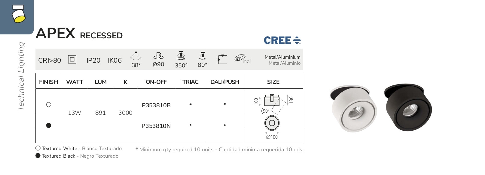 Лед луничка / луна, спот лампа P353810N (Recessed LED 4000K Black) ще осигури комфорт и естетика във всяко помещение, в което се постави. Цялостната визия и дизайн на led лампата и вложените в изработката й материали, като метал и алуминий в цвят черен мат, регулируема глава - накланяща се на 80º и завъртаща се на 350º, ще допринесат за един неповторим стил. Благодарение на дългогодишния опит в производството на лед осветление, качествените материали и строгия контрол на качеството на изработка на производителя ACB (Испания), P353810N (Recessed LED 4000K Black) е на високо европейско ниво.