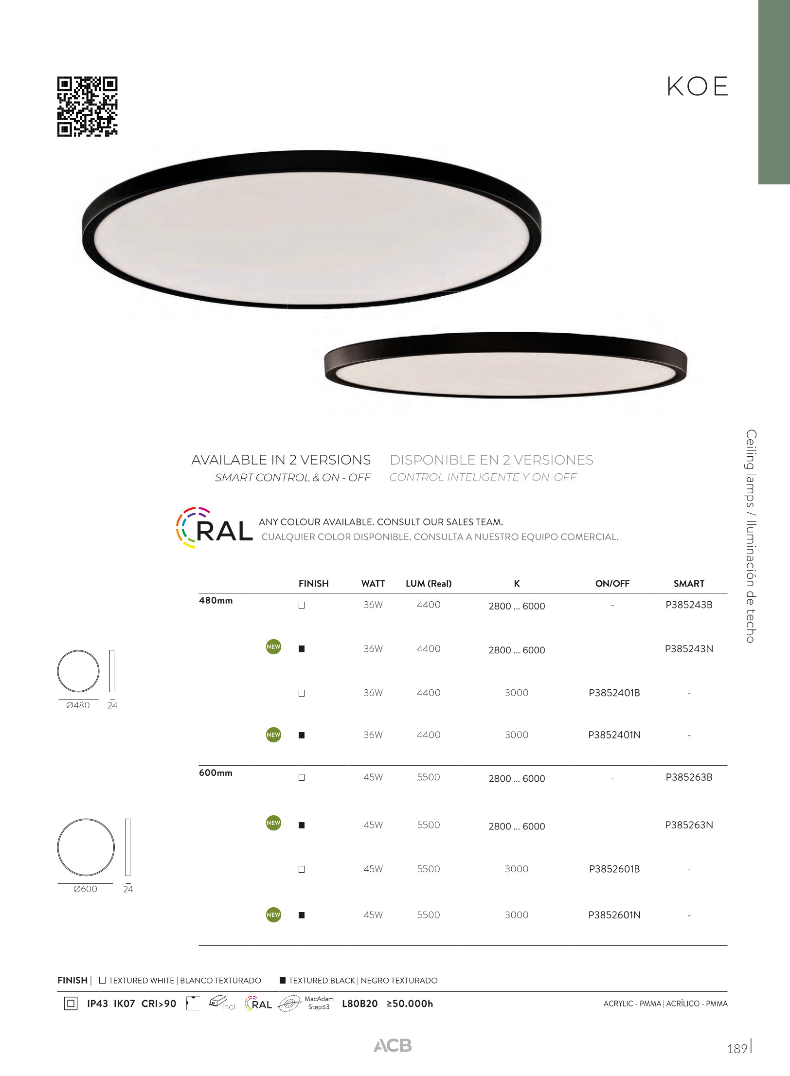 Осветителното тяло P385263B (Ceiling /60cm LED 2800K-5000K White) ще осигури комфорт и естетика във всяко помещение, в което се постави. Цялостната визия и дизайн на лампата и вложените в изработката й материали, като полимер (РММА) в текстурирано бяло, акрил в бял цвят, контрол на цветната температура 2800-6000К и димиране с приложения за смартфон, ще допринесат за един неповторим стил. Благодарение на дългогодишния опит, качествените материали и строгия контрол на качеството на изработка на производителя ACB (Испания), P385263B (Ceiling /60cm LED 2800K-5000K White) е на високо европейско ниво.