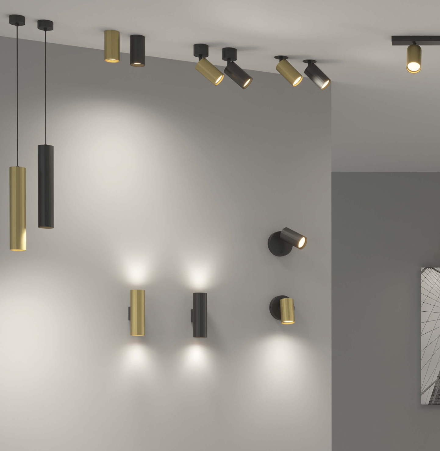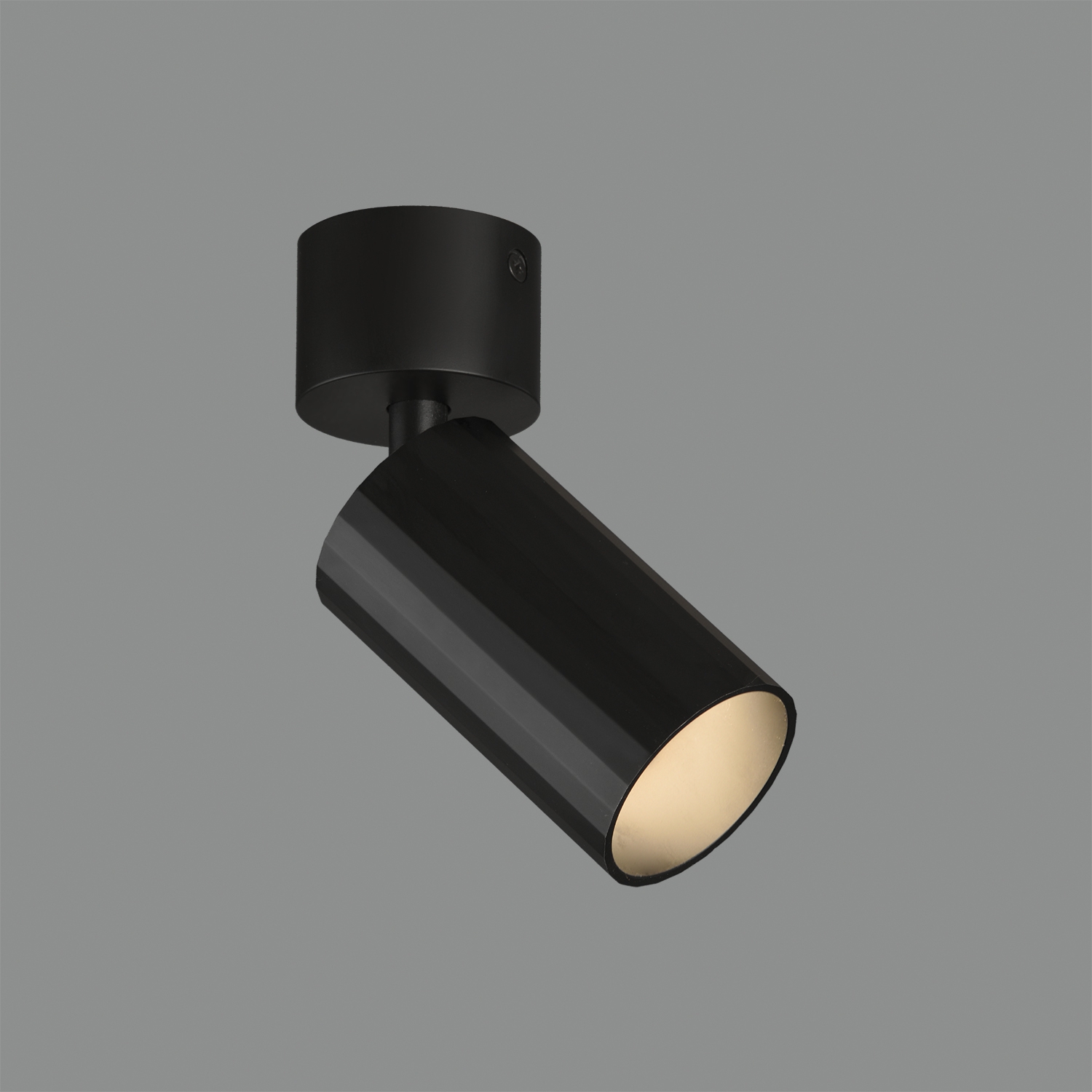 алумениева основа в черен цвят, подвижни алуминиеви осветителни тeла в черно, ъгъл на завъртане 360° и ъгъл на светлинния лъч 90°