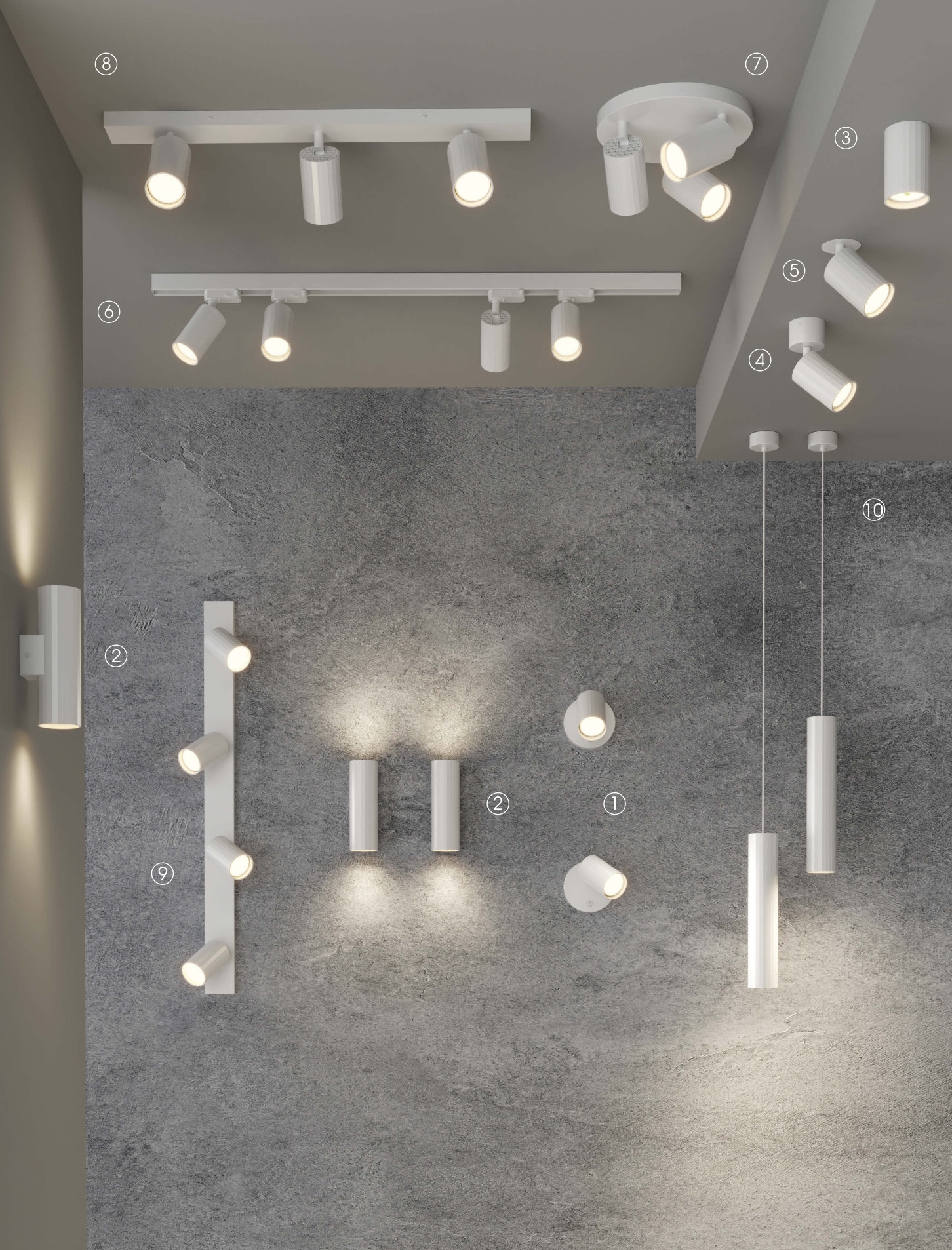 алуминиева основа в бял цвят, подвижни алуминиеви осветителни тeла в бяло, ъгъл на завъртане 360° и ъгъл на светлинния лъч 90°