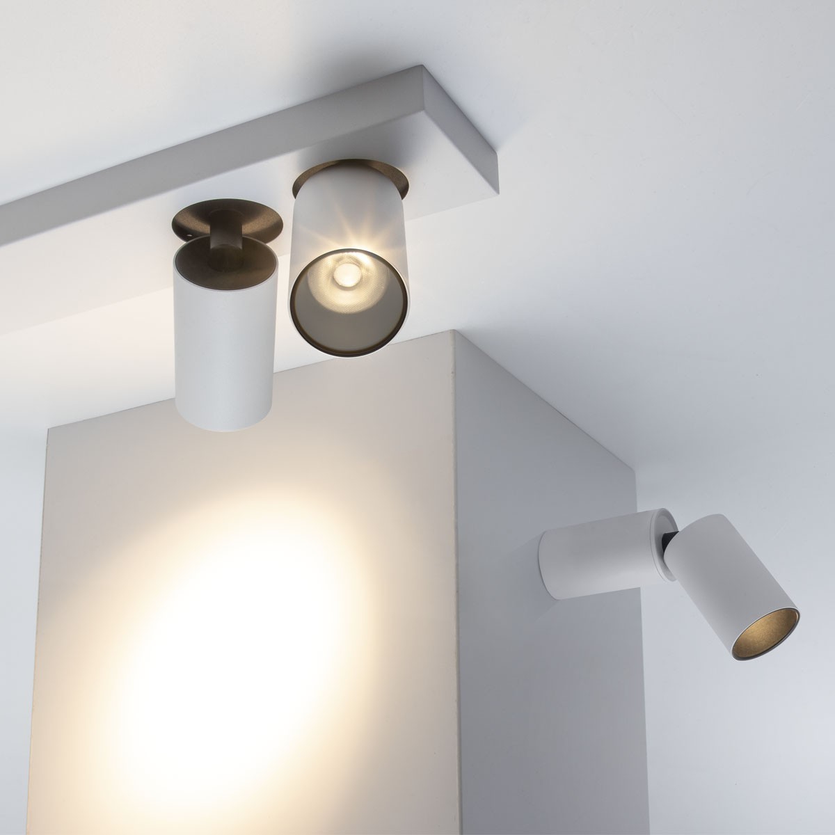 насочващи се тела от екструдиран алуминий в цвят матово бяло, декоративни пръстени от отлят под налягане алуминий, лещи FRESNEL от поликарбонат