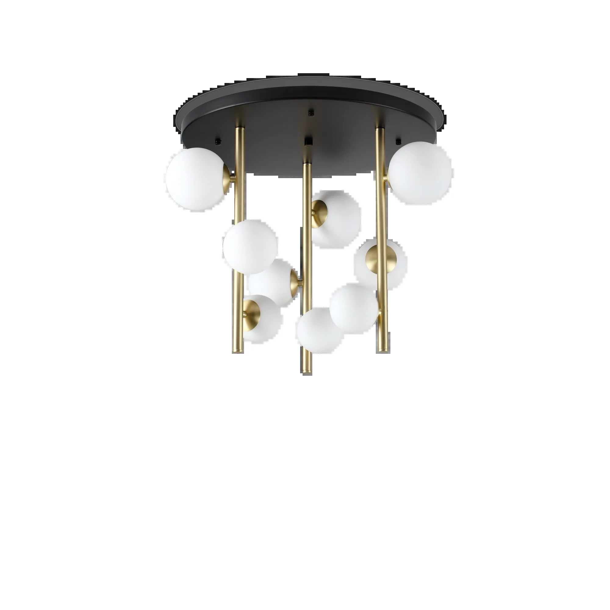 За стила и естетиката на интериора в изключително висока степен допринасят, както цялостната визия и дизайн на осветителното тяло, така и вложените в изработката висококачествени материали, като метална структура в матово черен цвят, метал в цвят сатен месинг, дифузери от гравирано стъкло в бяло.