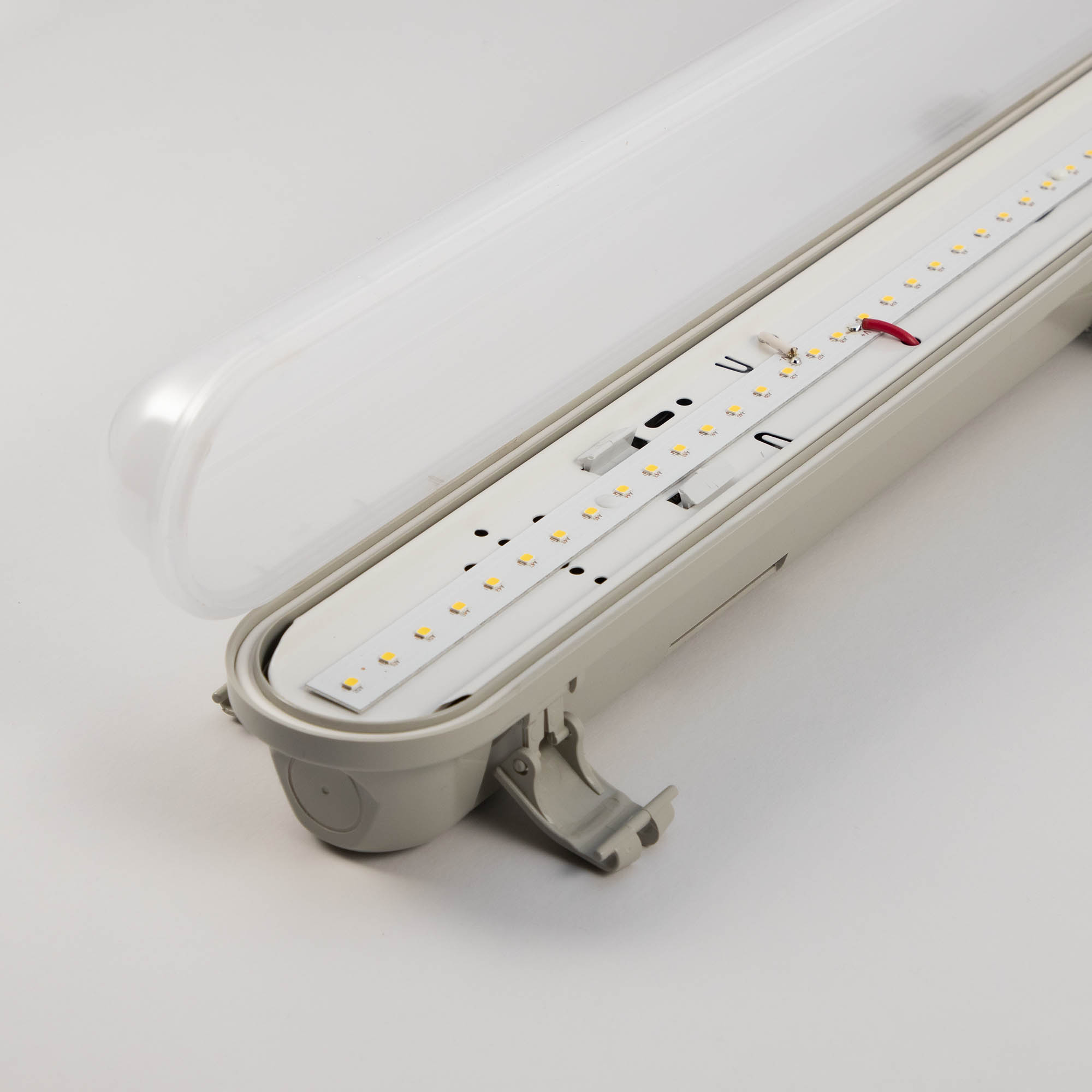 корпус от поликарбонат в сиво, UV стабилизиран, самогасящ се, прахо и водоустойчив, рефлектор от стомана в бяло, разсейвател от опалово бял поликарбонат, за среди до 40°C