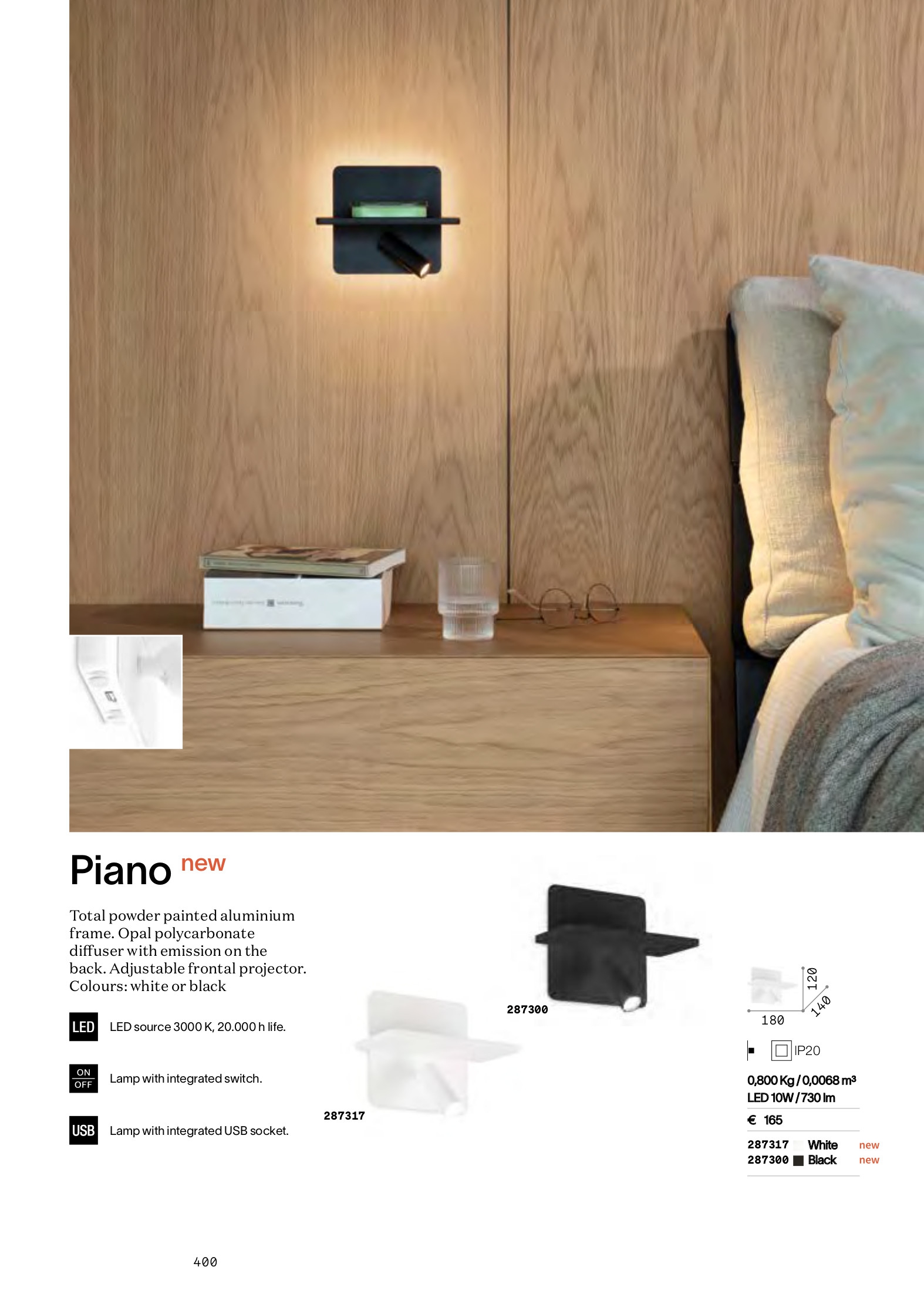 тяло от алуминий с прахово нанесено покритие в черен цвят, дифузер от поликарбонат в цвят бял опал, насочен към стената, регулируем прожектор, интегрирани ключове ON/OFF и USB порт