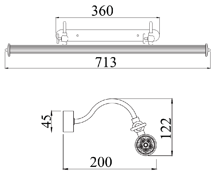 За стила и естетиката на обстановката допринасят, както цялостната визия и дизайн на осветителното тяло, така и вложените в изработката качествени материали, като: метал в цвят античен бронз с регулируем ъгъл на светене.