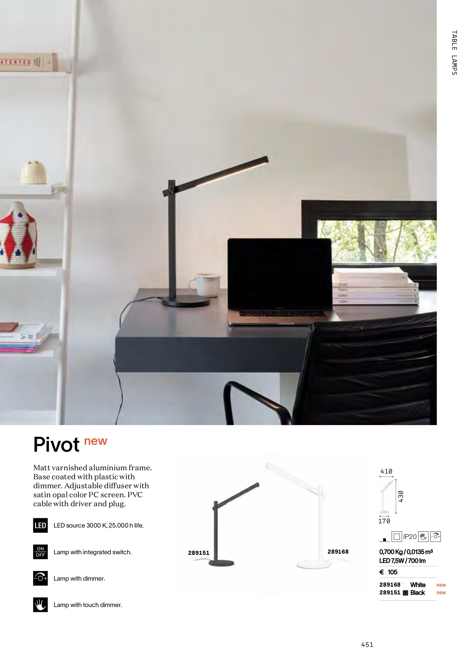 Стилът и естетиката на интериора ще се обогатят благодарение, както на цялостната визия, стил и дизайн на осветителното тяло, така и на вложените от производителя в изработката на PIVOT TL NERO, качествени материали, като: алуминий в черен цвят, основа с полимерно покритие с touch димер, регулируем дифузер в цвят сатениран бял опал, PVC кабел с щепсел и драйвър.