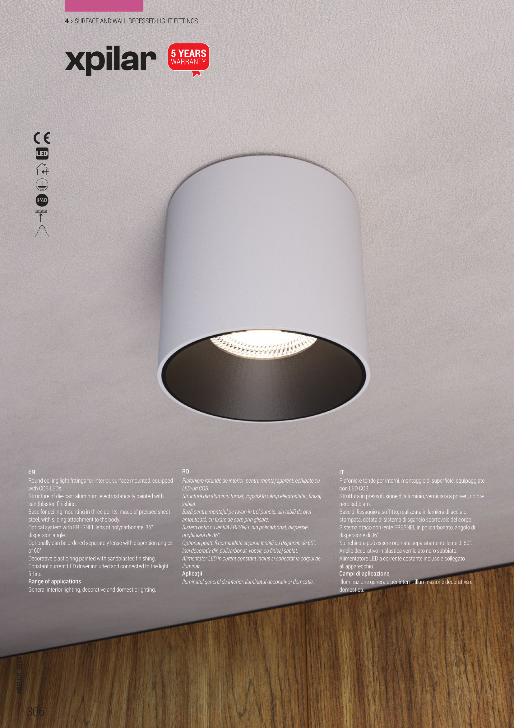 отлят алуминий с електростатично нанесено покритие в пясъчно бял цвят, леща от поликарбонат с ъгъл на разсейване 36°, декоративен пръстен от полимер в пясъчно бял