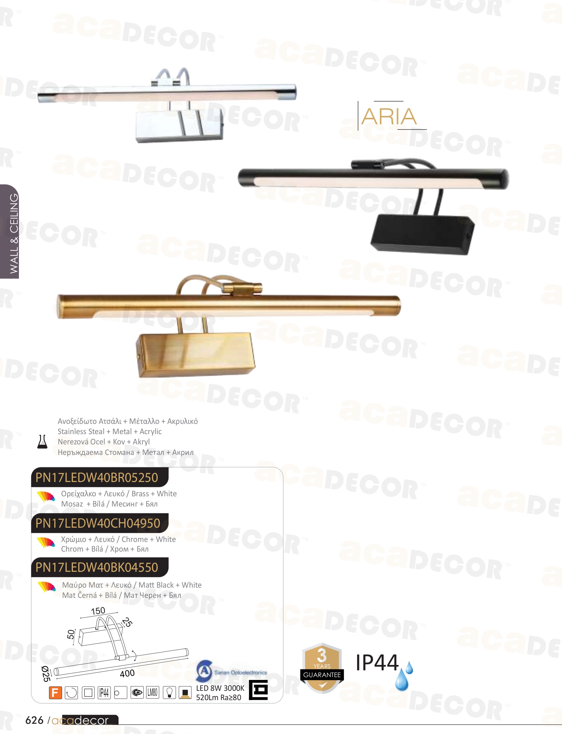 Осветителното тяло PN17LEDW40BR ще осигури комфорт и естетика във всяко помещение, в което се постави. Цялостната визия и дизайн на лампата и вложените в изработката й материали, като неръжзаема стомана в цвят месинг, полимер в бяло, ще допринесат за един неповторим стил. Благодарение на дългогодишния опит, качествените материали и строгия контрол на качеството на изработка на производителя ACA-Lighting (Гърция), PN17LEDW40BR е на високо европейско ниво.