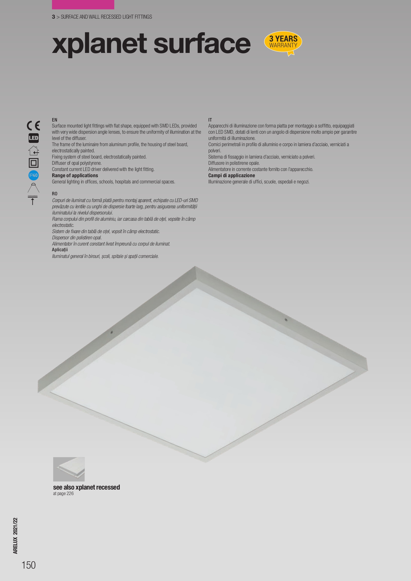алуминиев профил, корпус от стоманен борд, с електростатично нанесено матово бяло покритие, дифузер от опалово бял полимер, лещи с много широк ъгъл на дисперсия, за да се осигури еднаквост на осветяването на дифузера