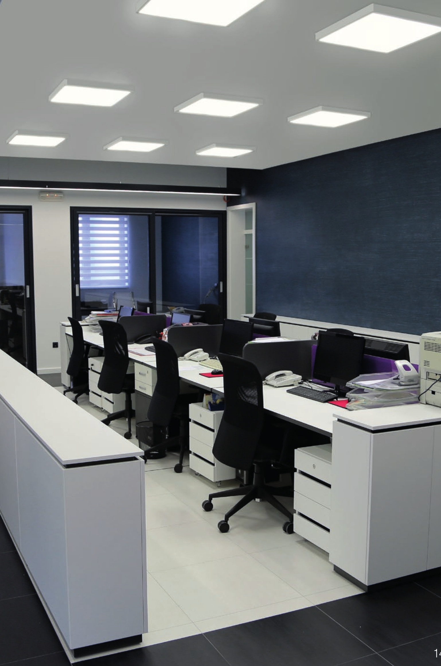 алуминиев профил, корпус от стоманен борд, с електростатично нанесено матово бяло покритие, дифузер от опалово бял полимер, лещи с много широк ъгъл на дисперсия, за да се осигури еднаквост на осветяването на дифузера