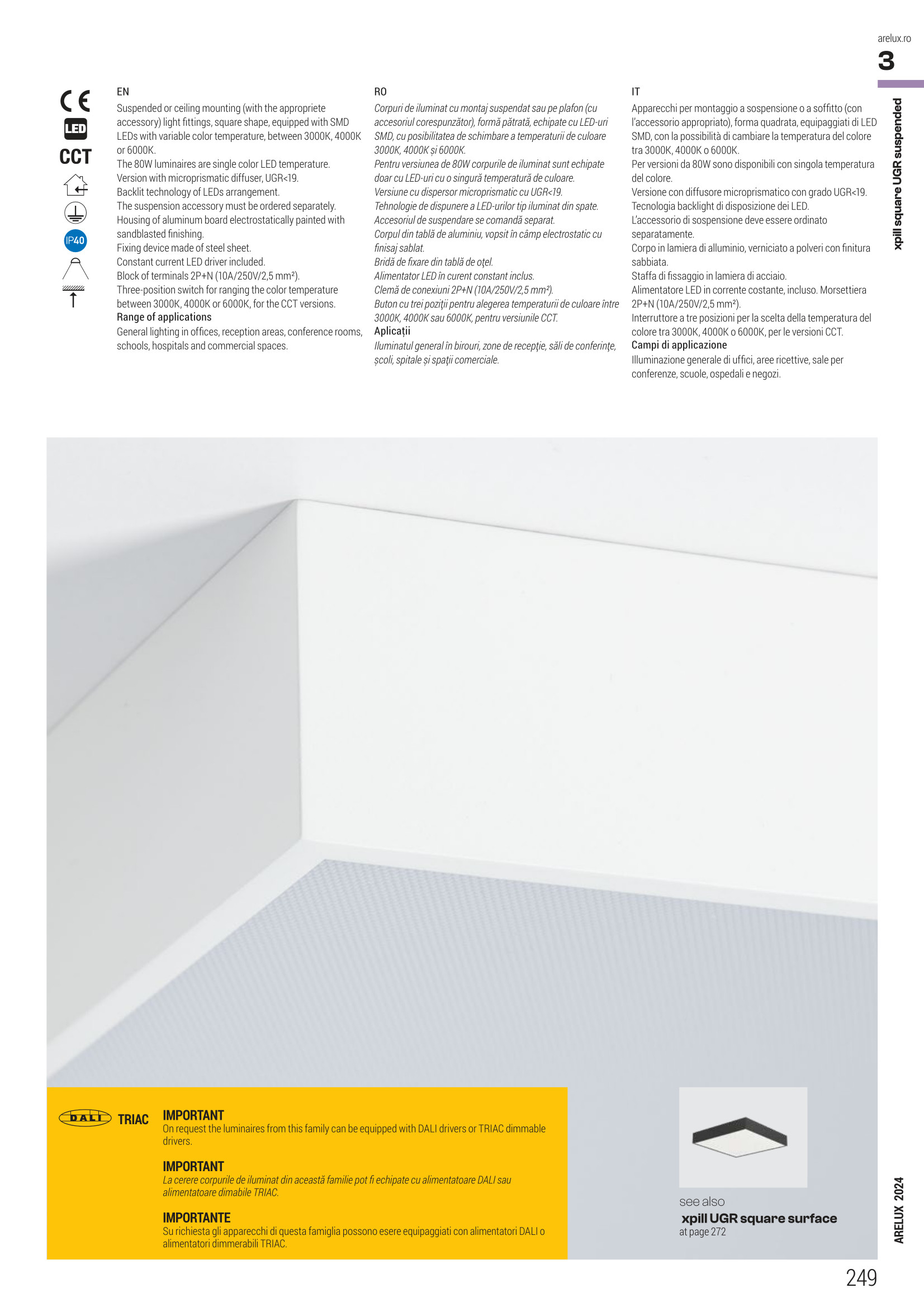 алуминий, с електростатично нанесено пясъкоструйно покритие в пясъчно бял цвят, двоен дифузьор от сатениран поликарбонат и с микропризми, трипозиционен превключвател за ССТ 3000K/4000K/6000K, при желание за окачване аксесоарът се поръчва отделно