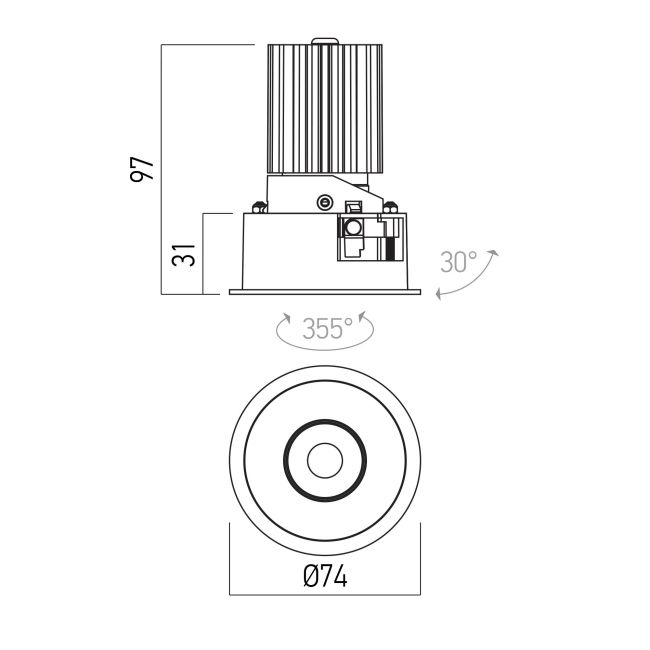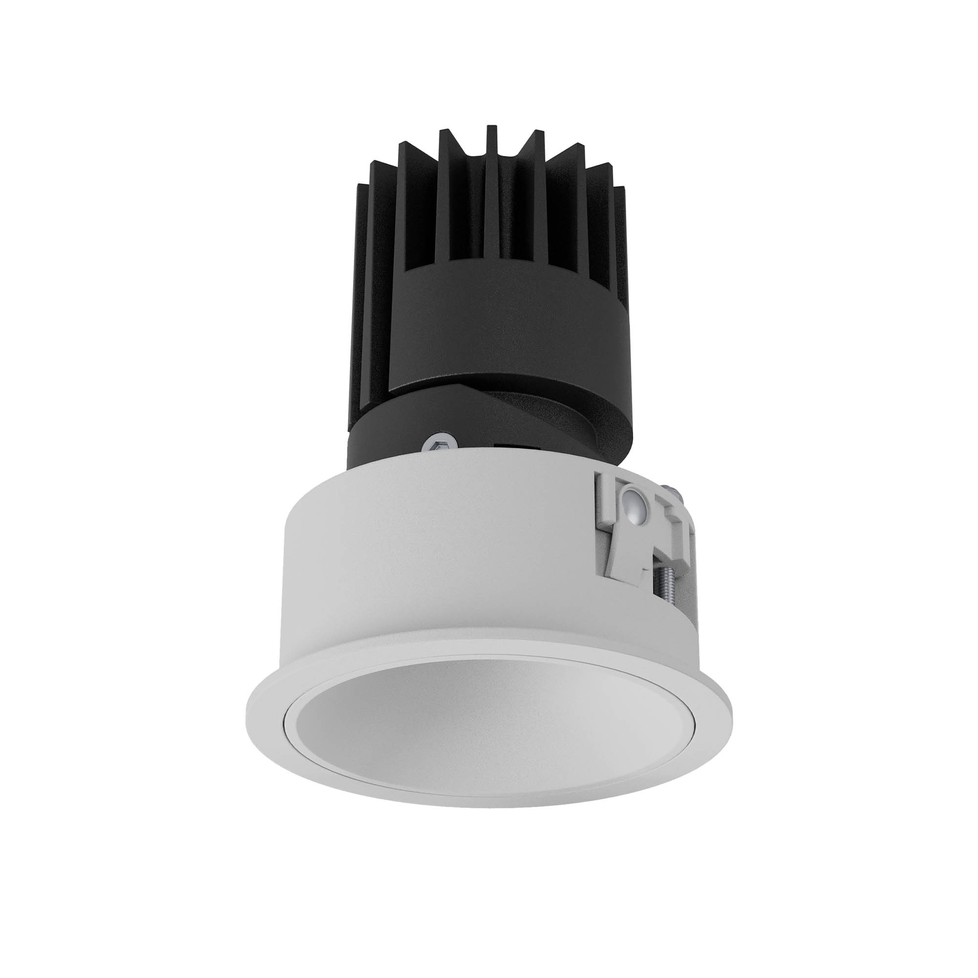 алуминий в бял цвят, нанесен с пясъкоструйна технология, радиатор от алуминий в черен цвят, вертикална регулация на светлината 0-30°, поликарбонатна леща с 36° дисперсия, пръстен от поликарбонат в бяло