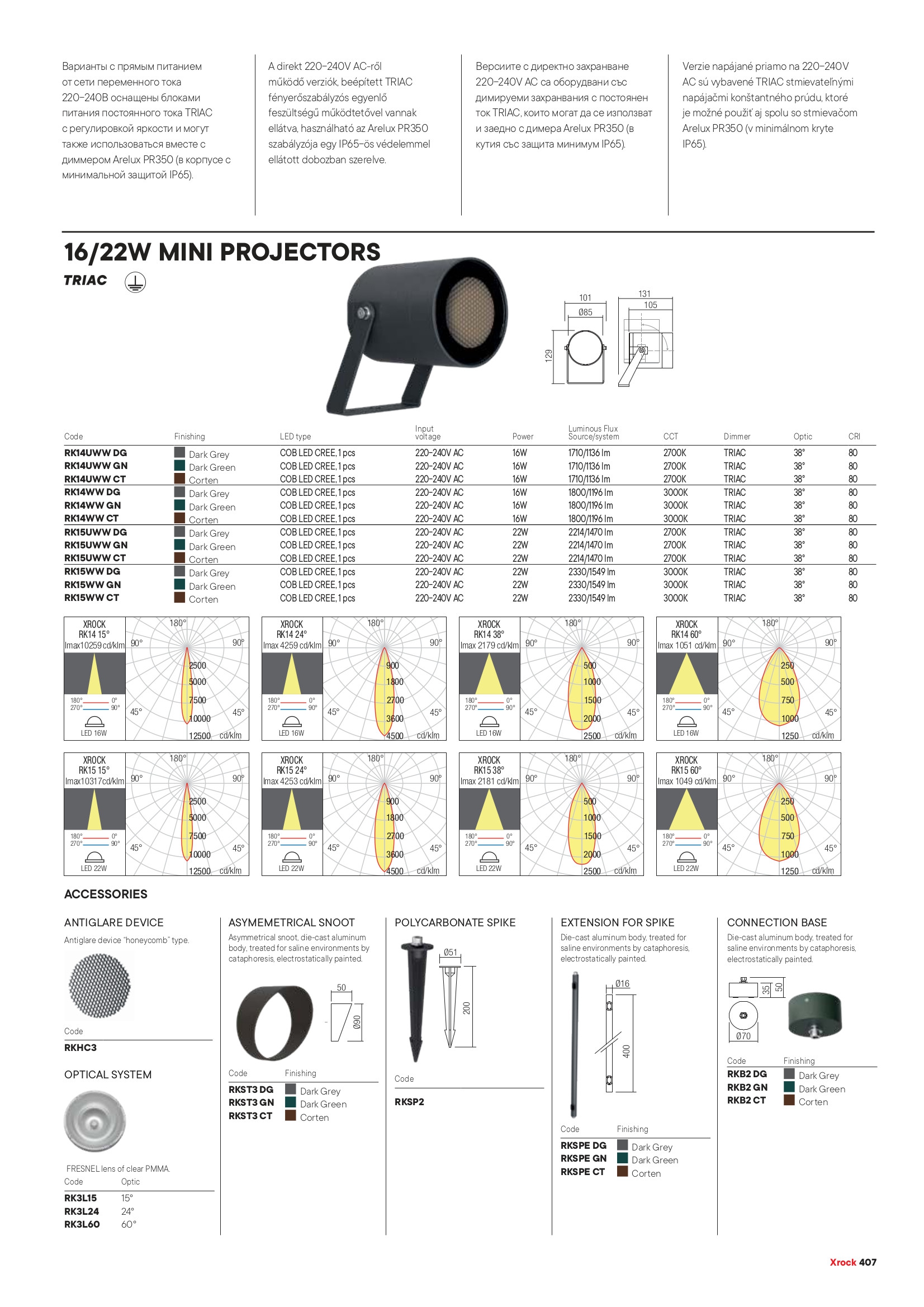 алуминий отлят под налягане с електростатично нанесено покритие в тъмно сиво, защитено от прах и влага, третирано за солени среди чрез фореза, оптична леща с ъгъл на дисперсия 38°, стъклен дифузер със ситопечатна рамка, аксесоарите се поръчват отделно