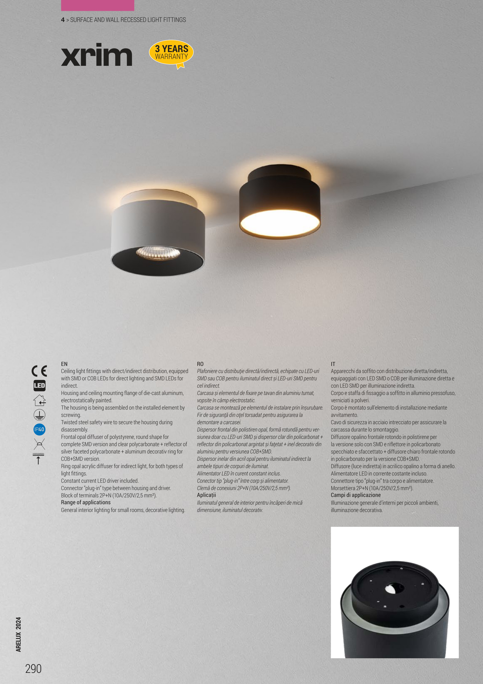 Осветителното тяло RM01WW SBK ще осигури комфорт и естетика във всяко помещение, в което се постави. Цялостната визия и дизайн на лампата и вложените в изработката й материали, като отлят алуминий в пясъчно черен цвят, дифузьор от опалово бял полистерен за директна светлина, пръстен от опалово бял акрил за индиректна светлина, ще допринесат за един неповторим стил. Благодарение на дългогодишния опит, качествените материали и строгия контрол на качеството на изработка на дизайнерската линия Redo Arelux на производителя Redo (Румъния), RM01WW SBK е на високо европейско ниво.
