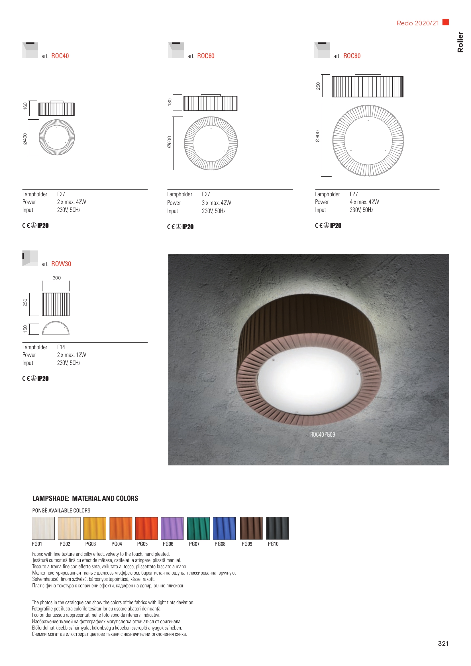 Осветителното тяло ROC40 PG ще осигури комфорт и естетика във всяко помещение, в което се постави. Цялостната визия и дизайн на лампата и вложените в изработката й материали, като метал в бял цвят, елементи в матиран никел, абажур от ръчно плисиран противопожарен плат, наличен в различни цветове, дифузер от бял опал, ще допринесат за един неповторим стил. Благодарение на дългогодишния опит, качествените материали и строгия контрол на качеството на изработка на дизайнерската линия Redo Indoor на производителя Redo (Румъния), ROC40 PG е на високо европейско ниво.