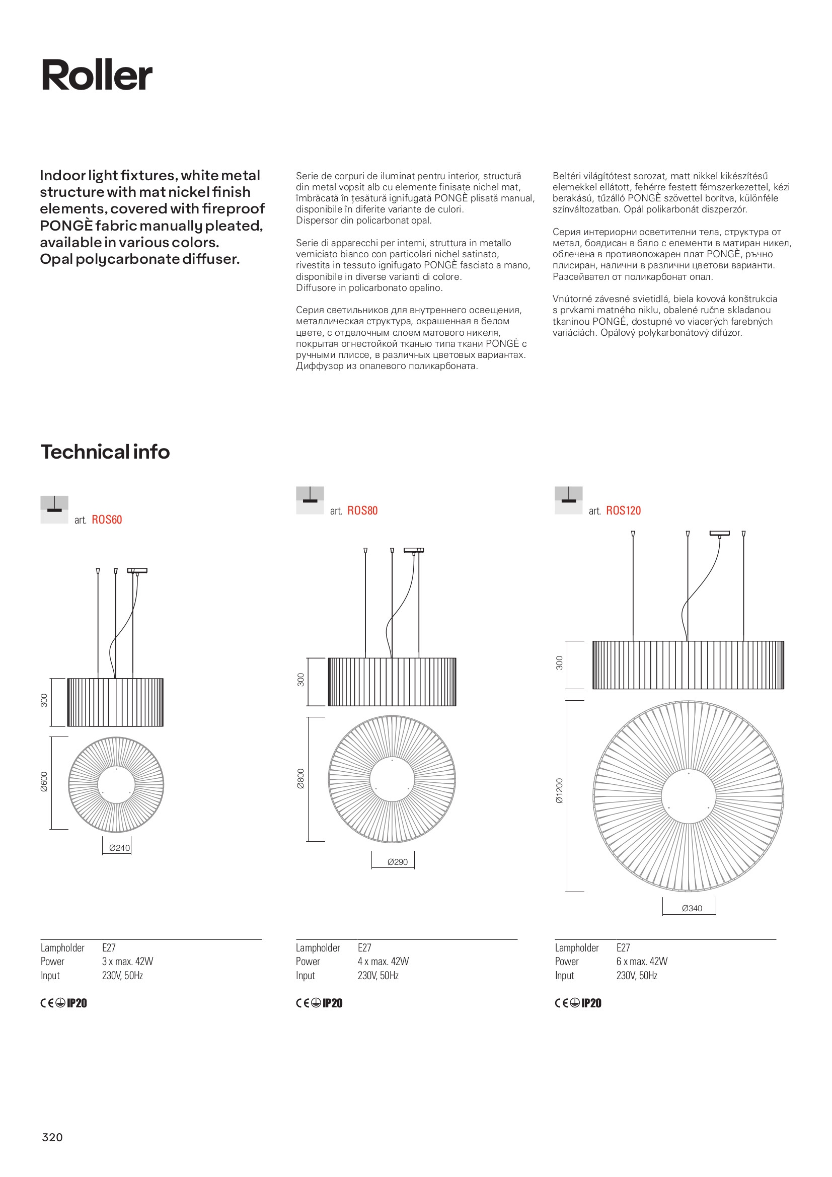 Осветителното тяло ROS60 PG ще осигури комфорт и естетика във всяко помещение, в което се постави. Цялостната визия и дизайн на лампата и вложените в изработката й материали, като метал в бял цвят, елементи в матиран никел, абажур от ръчно плисиран противопожарен плат, наличен в различни цветове, дифузер от бял опал, ще допринесат за един неповторим стил. Благодарение на дългогодишния опит, качествените материали и строгия контрол на качеството на изработка на дизайнерската линия Redo Indoor на производителя Redo (Румъния), ROS60 PG е на високо европейско ниво.