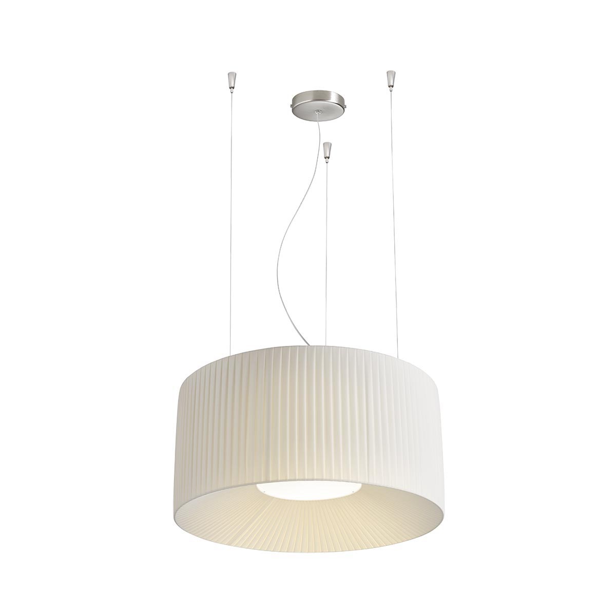метал в бял цвят, елементи в матиран никел, абажур от ръчно плисиран противопожарен плат, наличен в различни цветове, дифузер от бял опал