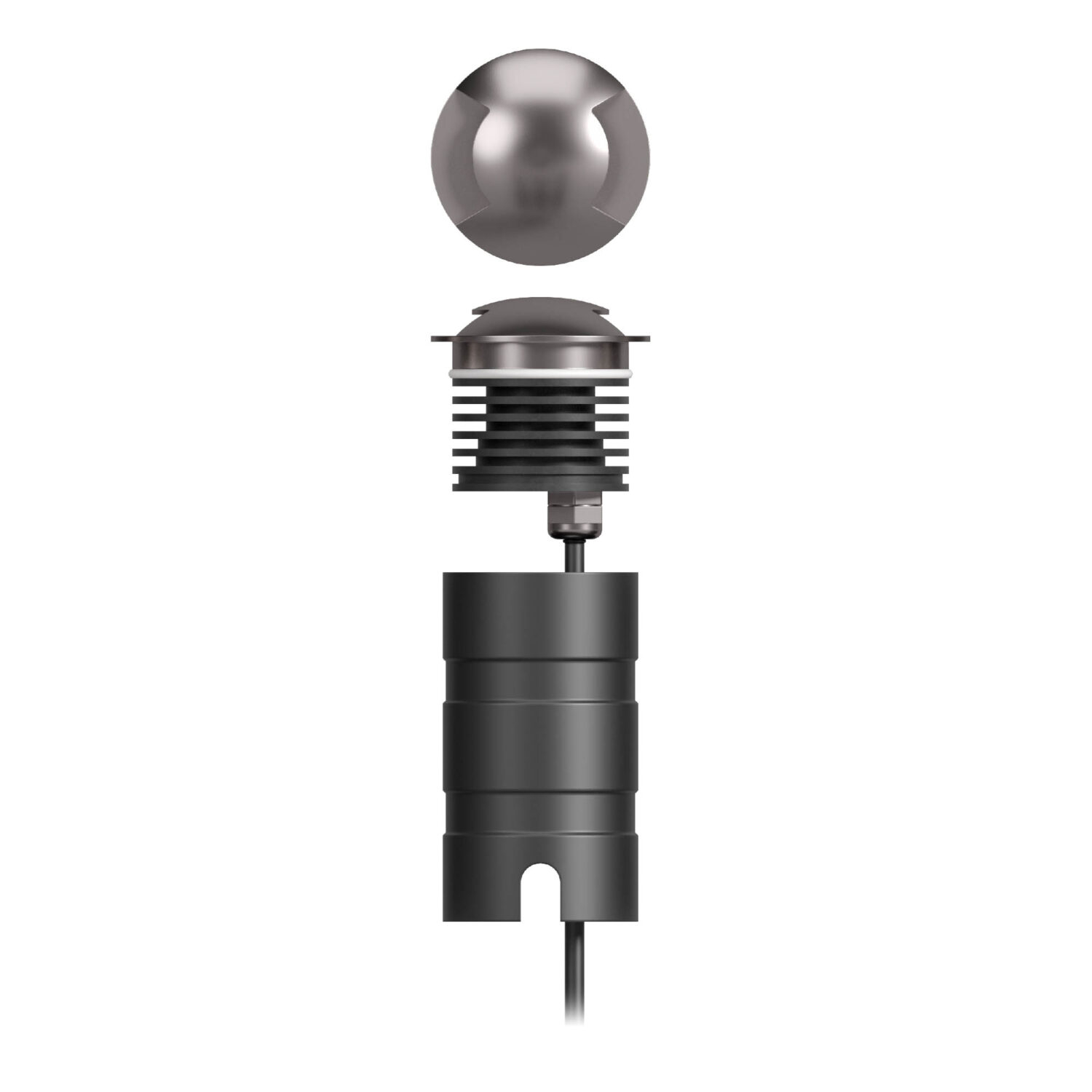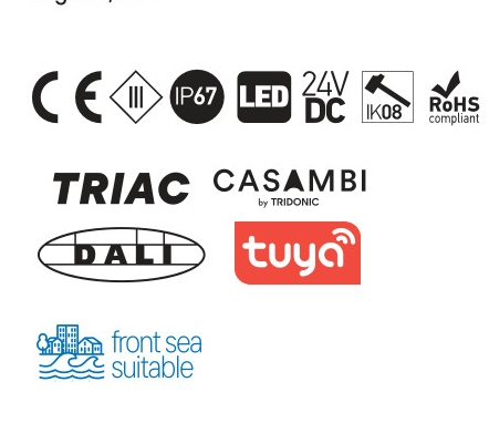 корпус от анодизиран лят алуминий и рамка от неръждаема стомана, разсейвател от прозрачен PMMA армиран с фибростъкло и оптична система R-2 (двупосочен), захранване 24VDC, драйверът се поръчва отделно, вградена кутия от алуминий