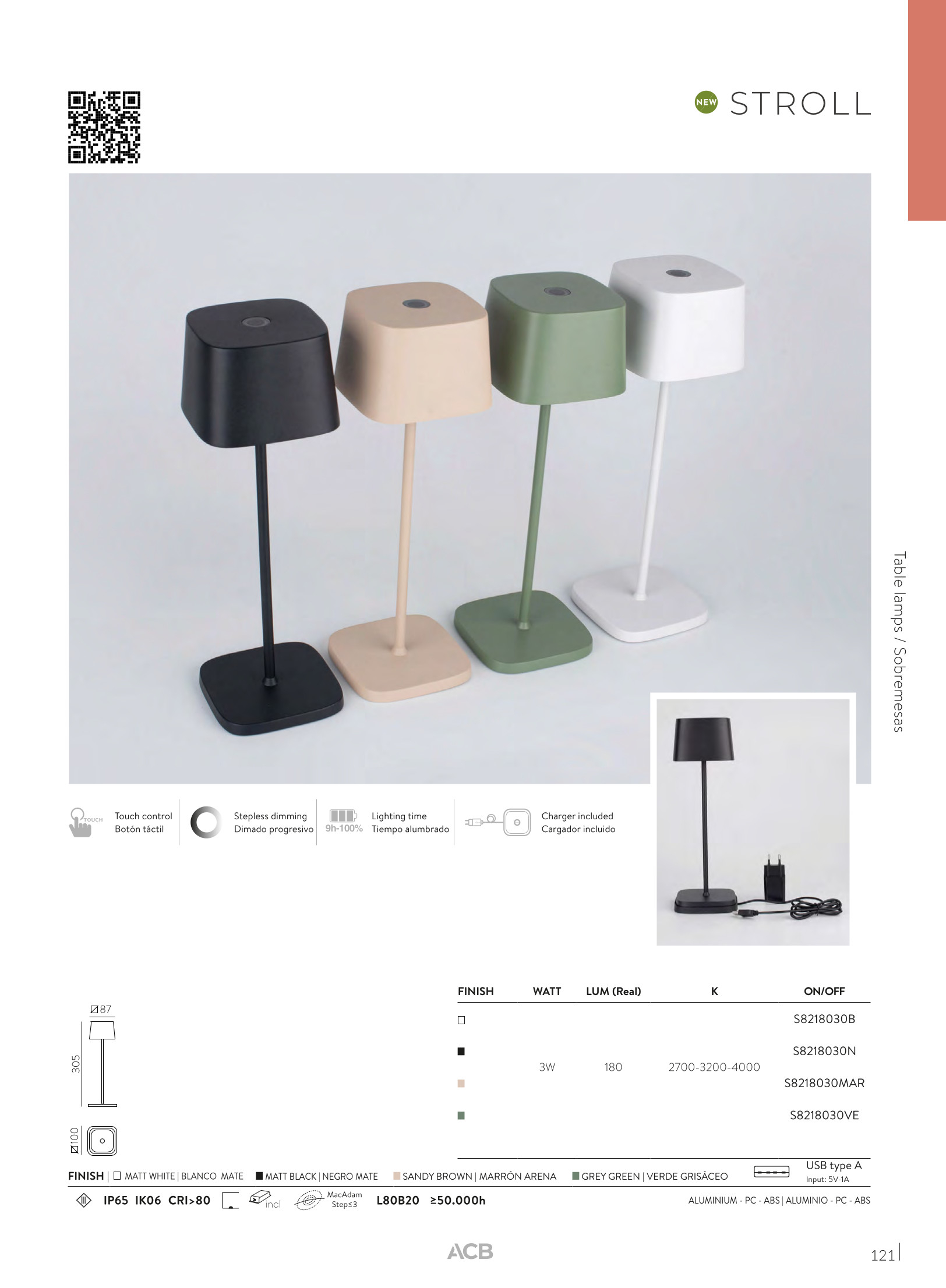 Лед настолна лампа S8218030VE ще осигури комфорт и естетика във всяко помещение, в което се постави. Цялостната визия и дизайн на led лампата и вложените в изработката й материали, като алуминий и полимер в сиво зелен цвят, димиране с докосване, зареждане със зарядно с USB тип А включено в комплекта, ССТ 2700-3200-4000К, автономност 9h, ще допринесат за един неповторим стил. Благодарение на дългогодишния опит в производството на лед осветление, качествените материали и строгия контрол на качеството на изработка на производителя ACB (Испания), S8218030VE е на високо европейско ниво.