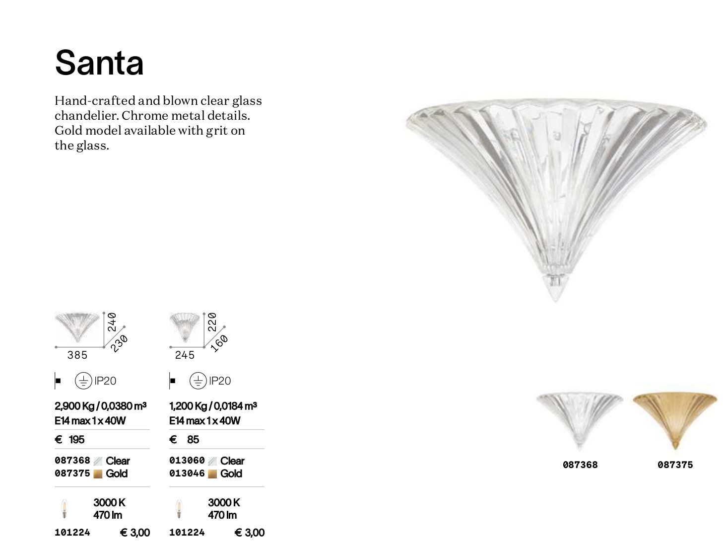 Осветителното тяло SANTA AP1 BIG TRANSPARENTE ще осигури комфорт и естетика във всяко помещение, в което се постави. Цялостната визия и дизайн на лампата и вложените в изработката й материали, като ръчно оформено, издухано, прозрачно стъкло, детайли от хромиран метал, ще допринесат за един неповторим стил. Благодарение на дългогодишния опит, качествените материали и строгия контрол на качеството на изработка на производителя Ideal-Lux (Италия), SANTA AP1 BIG TRANSPARENTE е на високо европейско ниво.