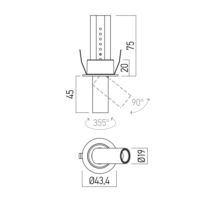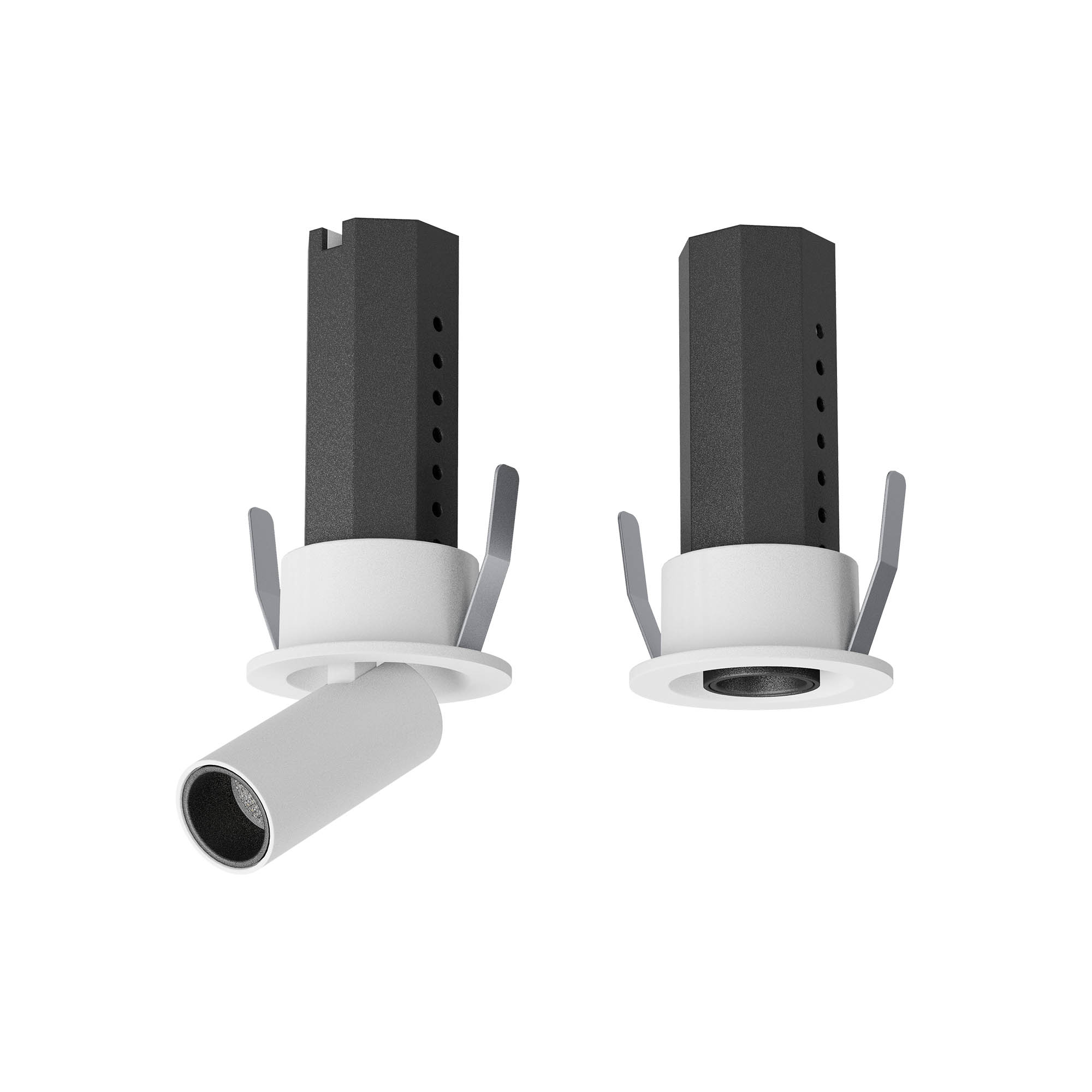алуминий в бял цвят, нанесен с пясъкоструйна технологrия, корпус, пръстен и странични плъзгачи от черен поликарбонат, Оптична система FRESNEL леща от поликарбонат с 36° ъгъл на дисперсия, изваждащо се и насочващо се тяло