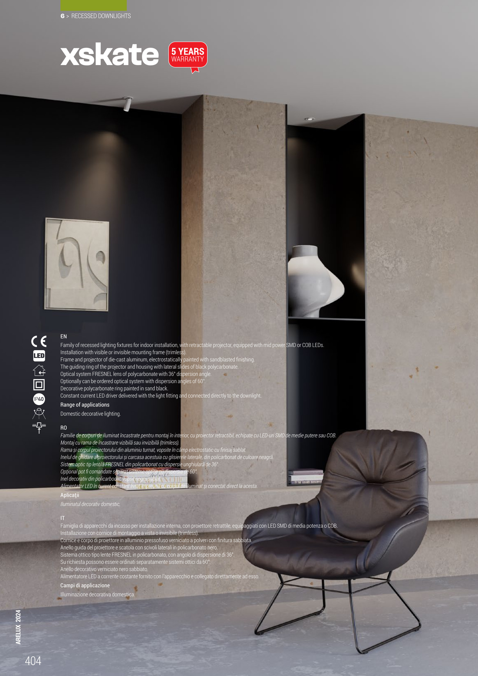 Осветителното тяло SE01WW SWH ще осигури комфорт и естетика във всяко помещение, в което се постави. Цялостната визия и дизайн на лампата и вложените в изработката й материали, като алуминий в бял цвят, нанесен с пясъкоструйна технологrия, корпус, пръстен и странични плъзгачи от черен поликарбонат, Оптична система FRESNEL леща от поликарбонат с 36° ъгъл на дисперсия, изваждащо се и насочващо се тяло, ще допринесат за един неповторим стил. Благодарение на дългогодишния опит, качествените материали и строгия контрол на качеството на изработка на дизайнерската линия Redo Arelux на производителя Redo (Румъния), SE01WW SWH е на високо европейско ниво.