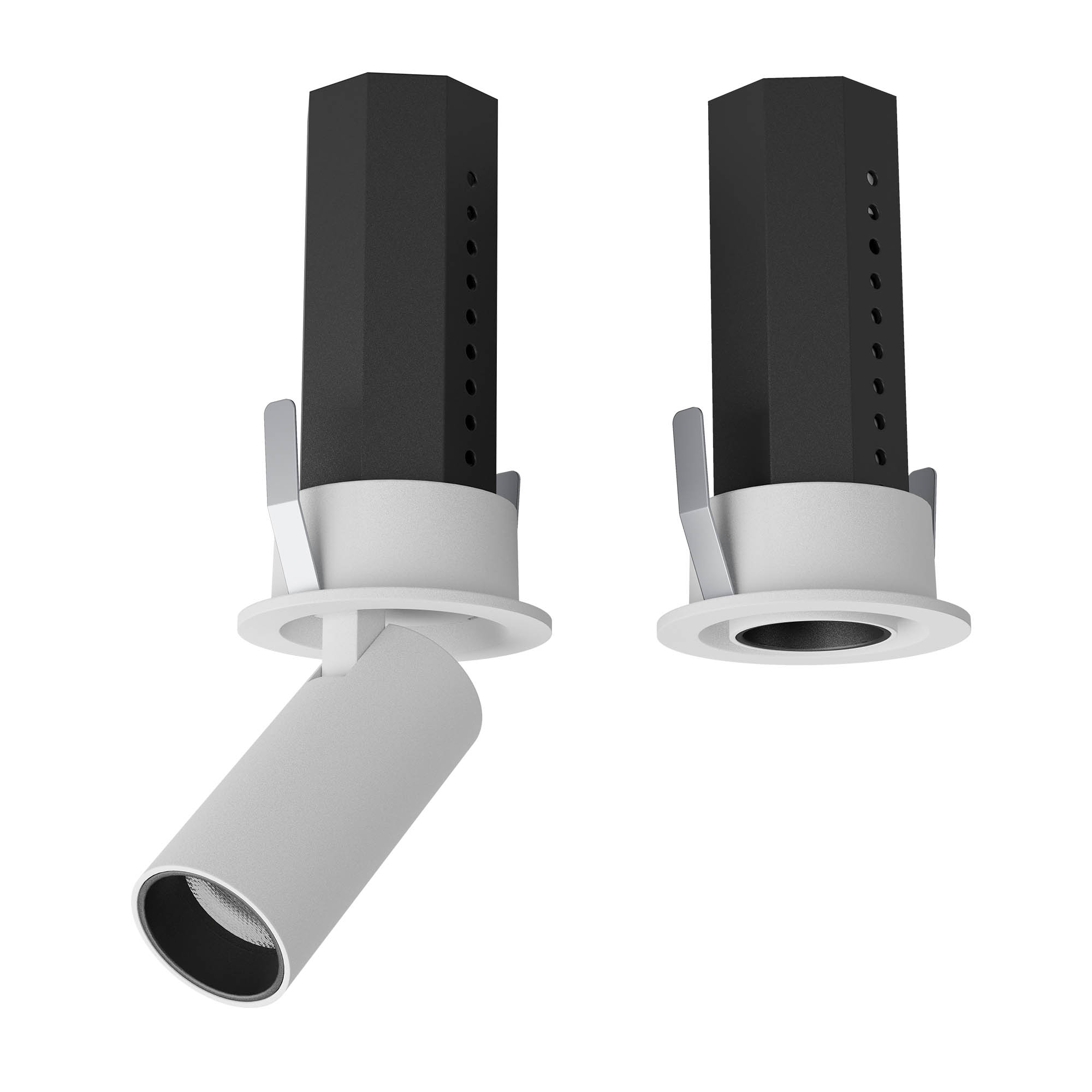 алуминий в бял цвят, нанесен с пясъкоструйна технологrия, корпус, пръстен и странични плъзгачи от черен поликарбонат, Оптична система FRESNEL леща от поликарбонат с 36° ъгъл на дисперсия, изваждащо се и насочващо се тяло