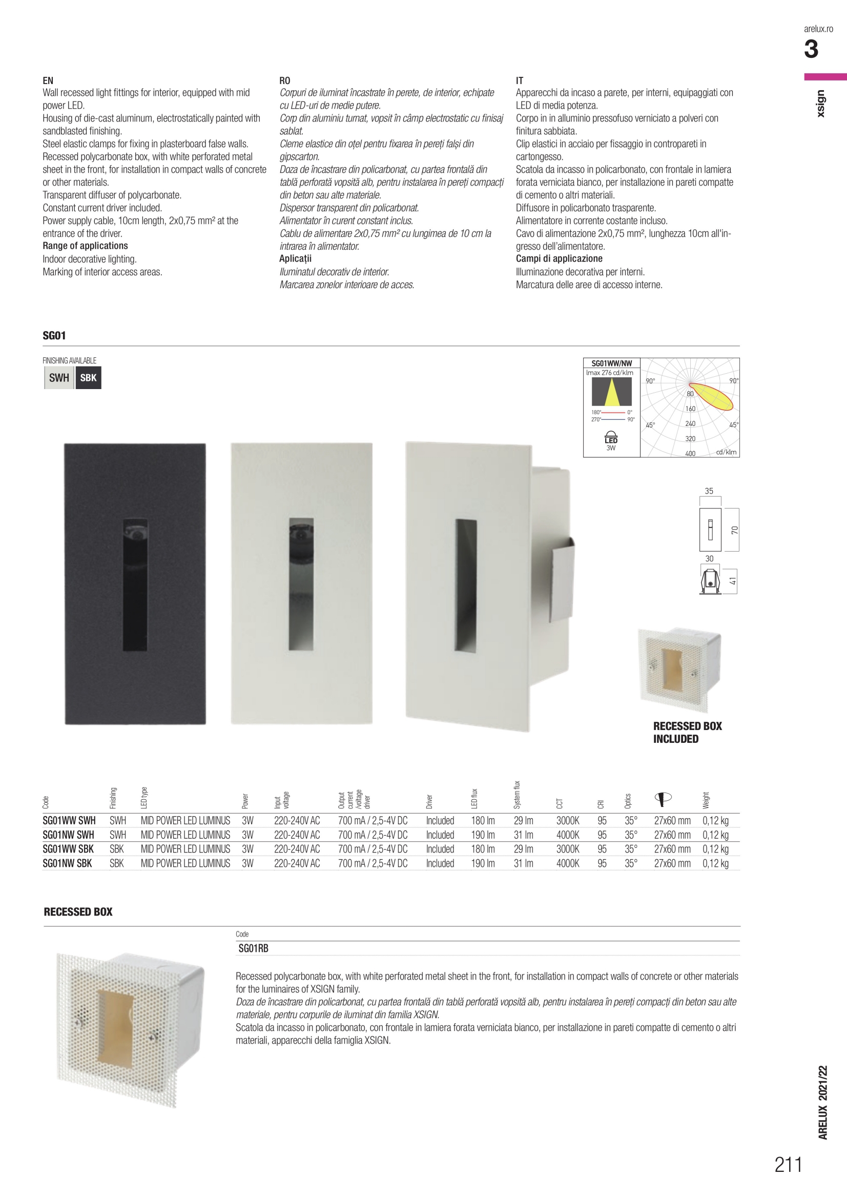 Лед аплик SG01WW SBK ще осигури комфорт и естетика във всяко помещение, в което се постави. Цялостната визия и дизайн на led лампата и вложените в изработката й материали, като лят алуминий с електростатично нанесено пясъкоструйно покритие в черно, скоби за закрепване към стени от гипсокартон, вградена кутия от поликарбонат с бял перфориран метал лист в предната част за монтаж в стени от бетон, прозрачен дифузьор от поликарбонат, ще допринесат за един неповторим стил. Благодарение на дългогодишния опит в производството на лед осветление, качествените материали и строгия контрол на качеството на изработка на дизайнерската линия Redo Arelux на производителя Redo (Румъния), SG01WW SBK е на високо европейско ниво.