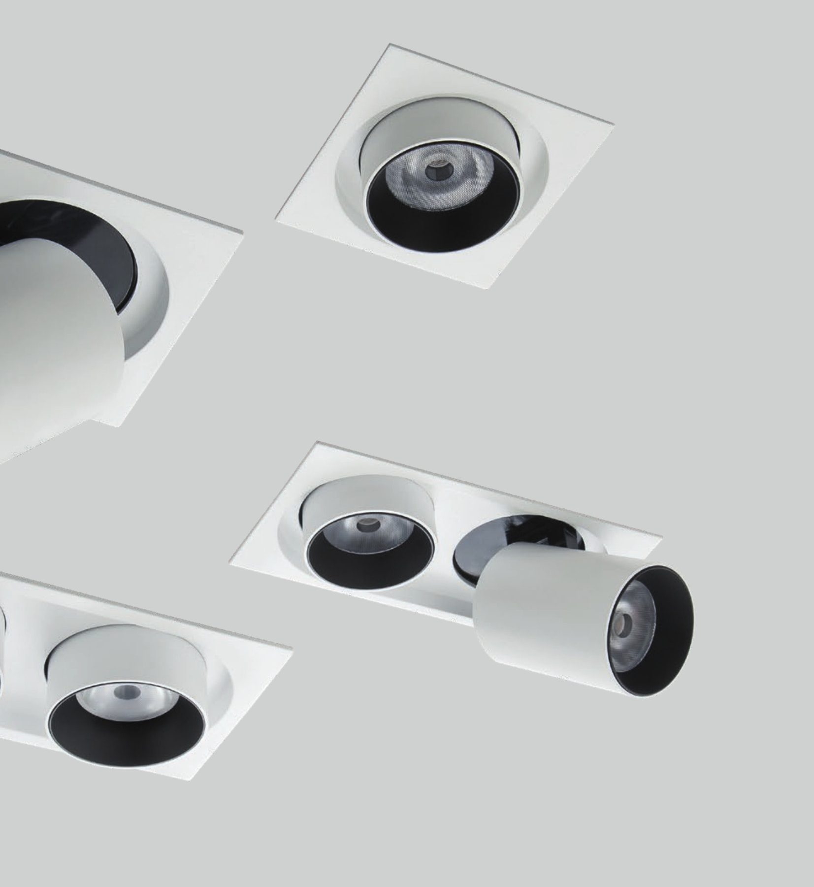 рамка и тяло от лят алуминий в пясъчно бял цвят, корпус и плъзгачи от черен поликарбонат, декоративен алуминиев пръстен в матово черно, оптични системи с лещи FRESNEL, ъгъл на дисперсия 38°, прибиращ се проектор