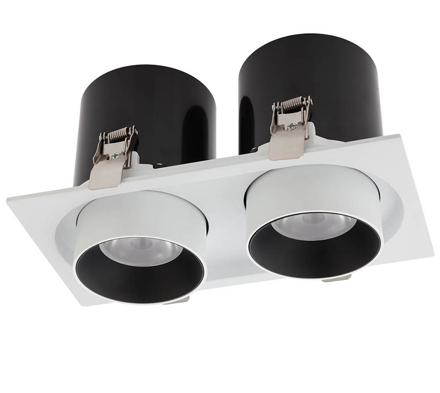 рамка и тяло от лят алуминий в пясъчно бял цвят, корпус и плъзгачи от черен поликарбонат, декоративен алуминиев пръстен в матово черно, оптични системи с лещи FRESNEL, ъгъл на дисперсия 38°, прибиращ се проектор