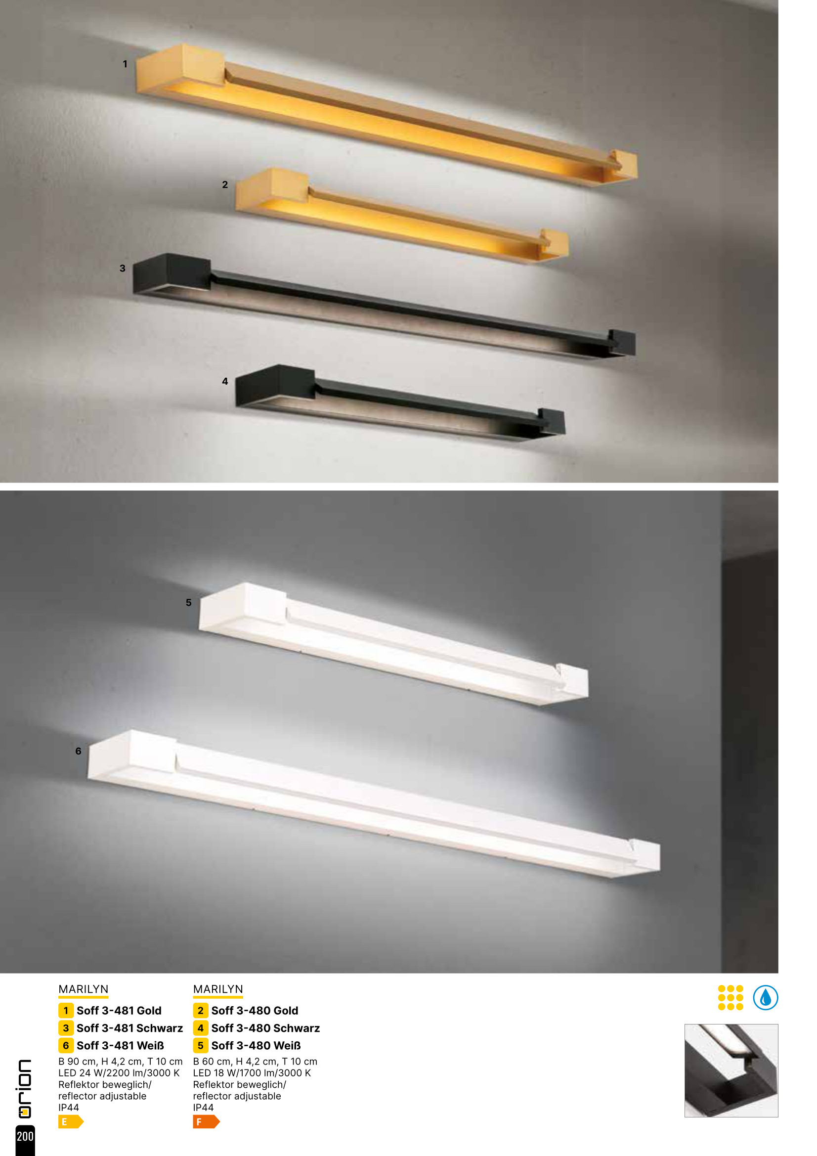 Осветителното тяло Soff 3-480 gold (LED18W/1700lm/3000K) представлява лед аплик в съвременен стил. Soff 3-480 gold (LED18W/1700lm/3000K) е от категорията и е подходящо за осветяване на различни помещения и пространства като: баня.