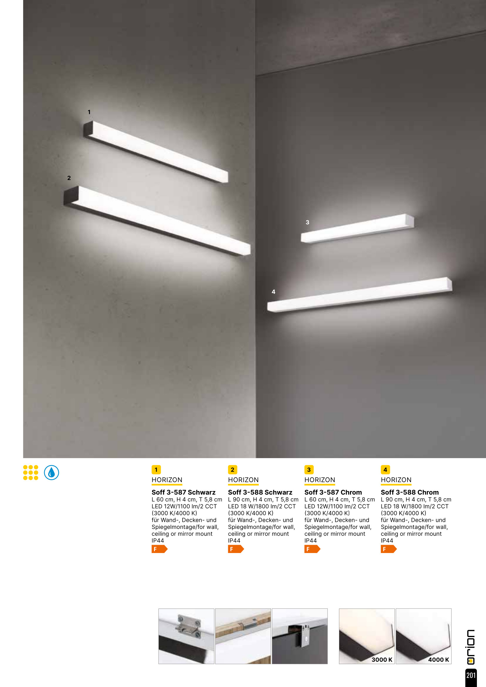 Осветителното тяло Soff 3-588 chrom (LED18W/1800lm/2CCT) ще осигури комфорт и естетика във всяко помещение, в което се постави. Цялостната визия и дизайн на лампата и вложените в изработката й материали, като алуминий в цвят хром, поликарбонат в цвят опал мат, ССТ 3000/4000К, скобите за монтаж на огледало или вертикална повърхност са включени в комплекта, ще допринесат за един неповторим стил. Благодарение на дългогодишния опит, качествените материали и строгия контрол на качеството на изработка на производителя Orion (Австрия), Soff 3-588 chrom (LED18W/1800lm/2CCT) е на високо европейско ниво.