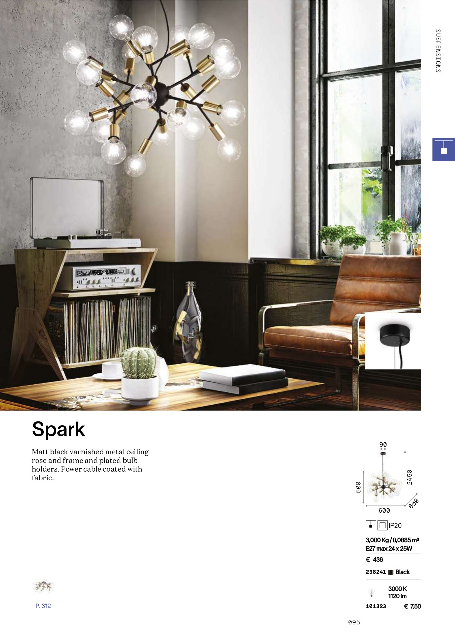 Осветителното тяло SPARK SP24 ще осигури комфорт и естетика във всяко помещение, в което се постави. Цялостната визия и дизайн на лампата и вложените в изработката й материали, като метал в цвят черен мат, държачи за крушки в цвят месинг, черен захранващ кабел с текстилна оплетка, ще допринесат за един неповторим стил. Благодарение на дългогодишния опит, качествените материали и строгия контрол на качеството на изработка на производителя Ideal-Lux (Италия), SPARK SP24 е на високо европейско ниво.