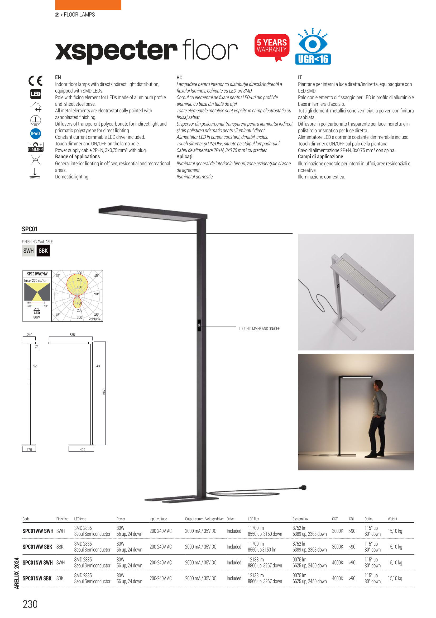 Лед лампион / правостояща лампа SPC01WW SBK ще осигури комфорт и естетика във всяко помещение, в което се постави. Цялостната визия и дизайн на led лампата и вложените в изработката й материали, като метал в черно, дифузер от поликарбонат за индиректна светлина и втори - от полистерен за директна, ключ ON/OFF и димер с докосване, ще допринесат за един неповторим стил. Благодарение на дългогодишния опит в производството на лед осветление, качествените материали и строгия контрол на качеството на изработка на дизайнерската линия Redo Arelux на производителя Redo (Румъния), SPC01WW SBK е на високо европейско ниво.