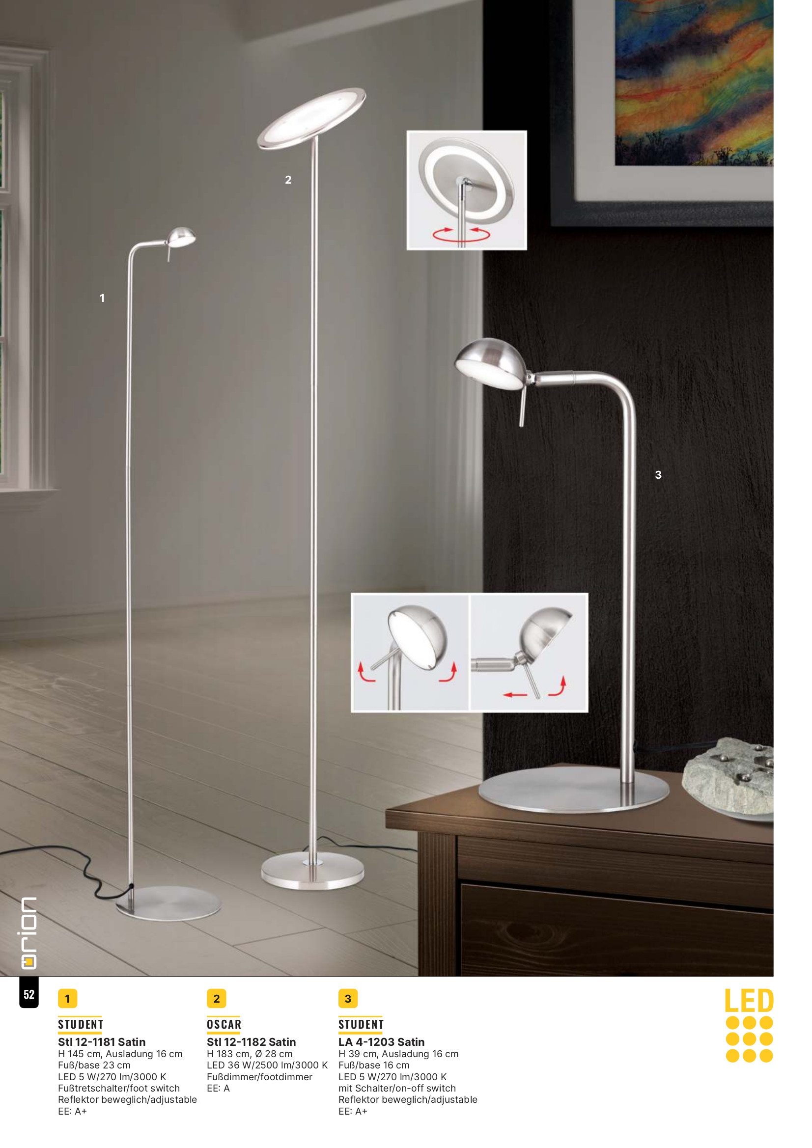 Лед лампион / правостояща лампа Stl 12-1182 satin (LED36W/2500lm/3000K) ще осигури комфорт и естетика във всяко помещение, в което се постави. Цялостната визия и дизайн на led лампата и вложените в изработката й материали, като стомана в цвят сатен хром, полимер в сатенирано бяло, ключ ON/OFF, ще допринесат за един неповторим стил. Благодарение на дългогодишния опит в производството на лед осветление, качествените материали и строгия контрол на качеството на изработка на производителя Orion (Австрия), Stl 12-1182 satin (LED36W/2500lm/3000K) е на високо европейско ниво.