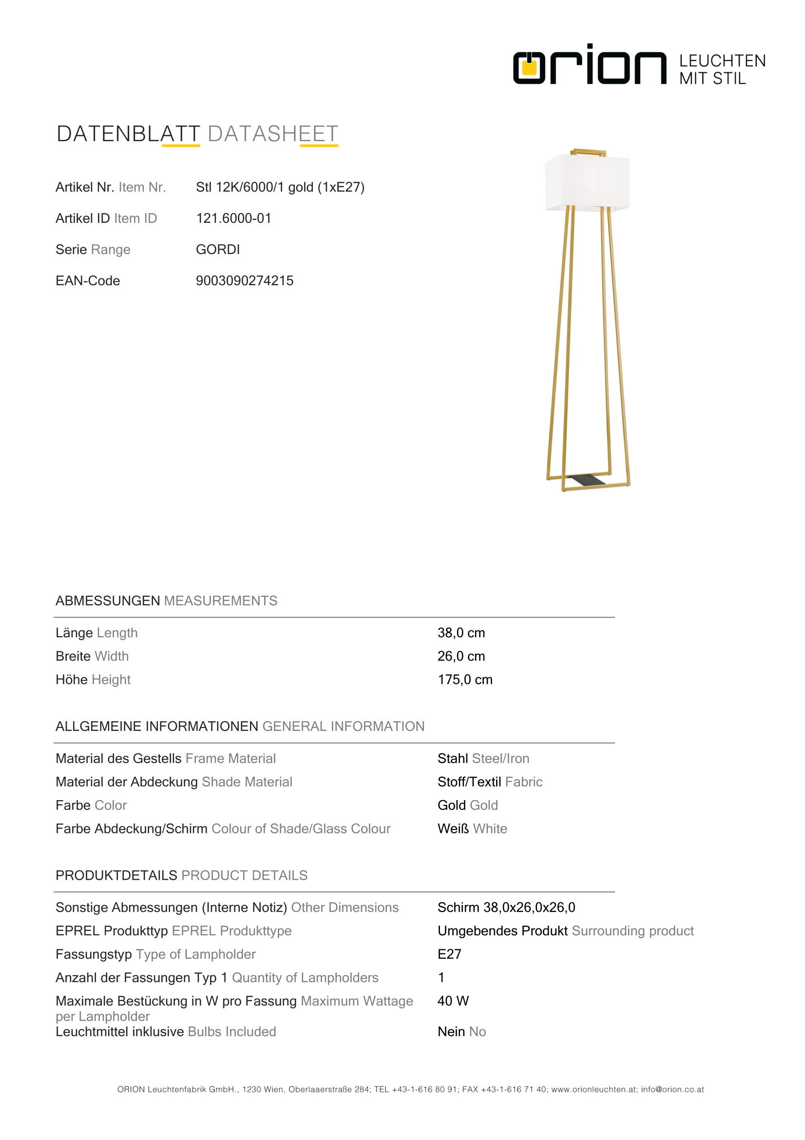 Изпълненото в съвременен стил осветителното тяло Stl 12K/6000/1 gold (1xE27) е един чудесен кандидат за постигане на изискан баланс между осветеност и визия във Вашето осветление за хол. Вложените в изработката материали (метал в цвят злато, текстил в бяло, превключвател ON/OFF), заедно с цялостния дизайн и излъчване на лампата ще допринесат за подобряване на обстановката и естетиката в дома Ви. Осветителното тяло представлява лампион / правостояща лампа и може да бъде използвано за осветление в различни помещения и пространства като: всекидневна / хол, спалня, трапезария, офис. Качеството на изработката на Orion (Австрия) е на най-високо европейско ниво. Благодарение на дългогодишния опит в производството на почти всички видове осветителни тела за интериорно осветление, качествените материали, високотехнологичните методи на производство и многостепенния контрол, осветителното тяло притежава отлични характеристики.