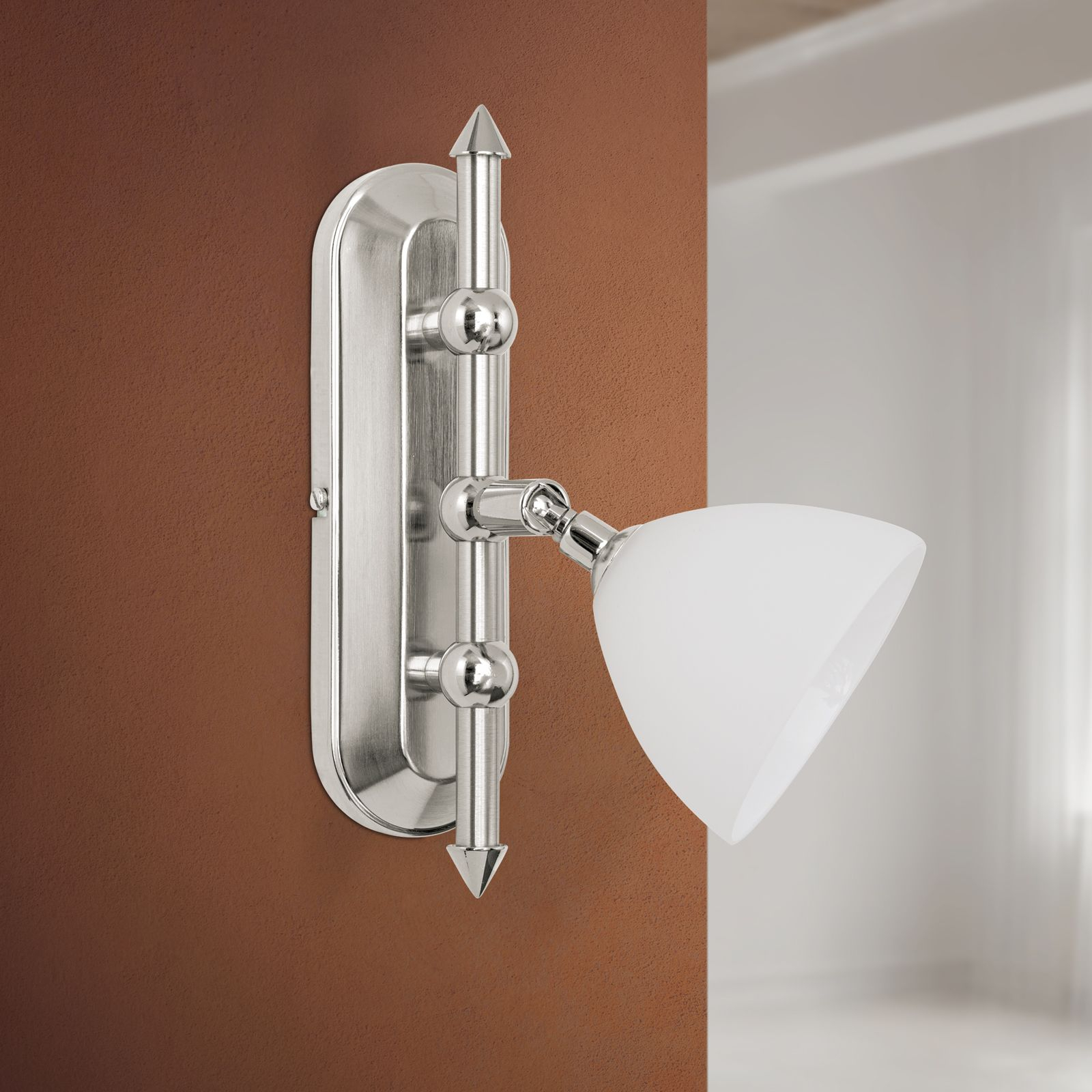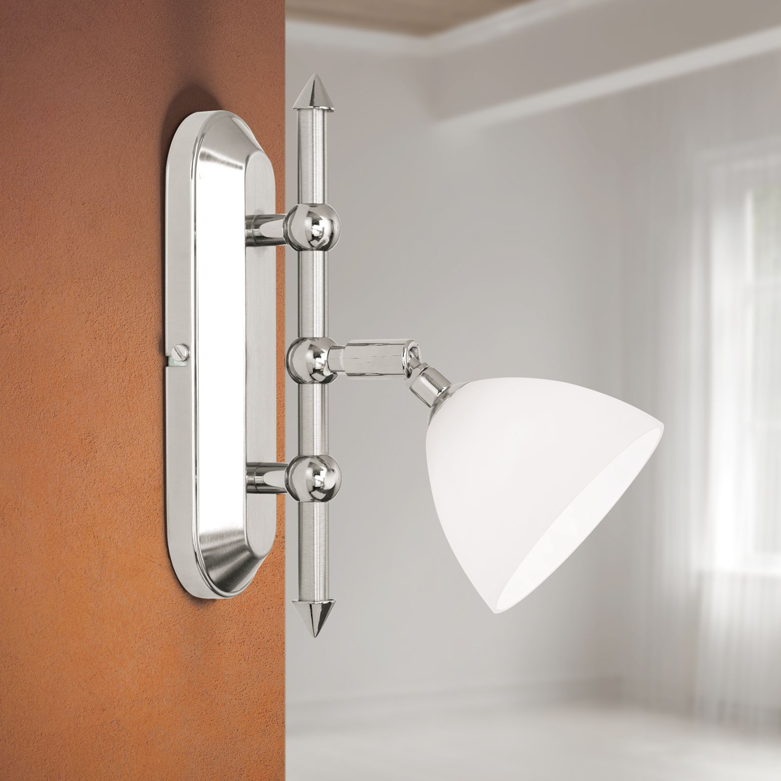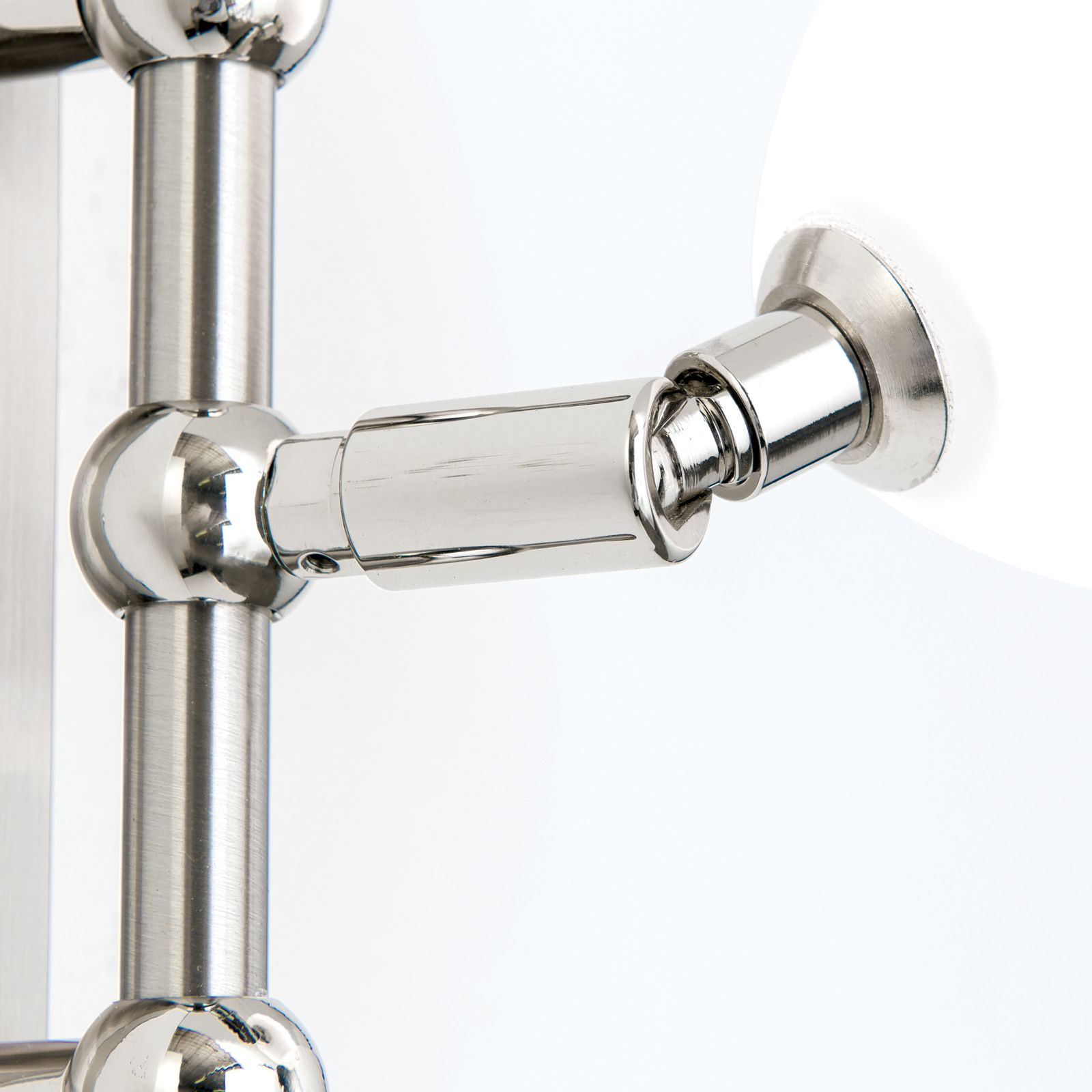 масивен месинг с покритие от сатениран и блестящ хром, стъкло в цвят бял сатен, насочваемь чашка на осветителното тяло
