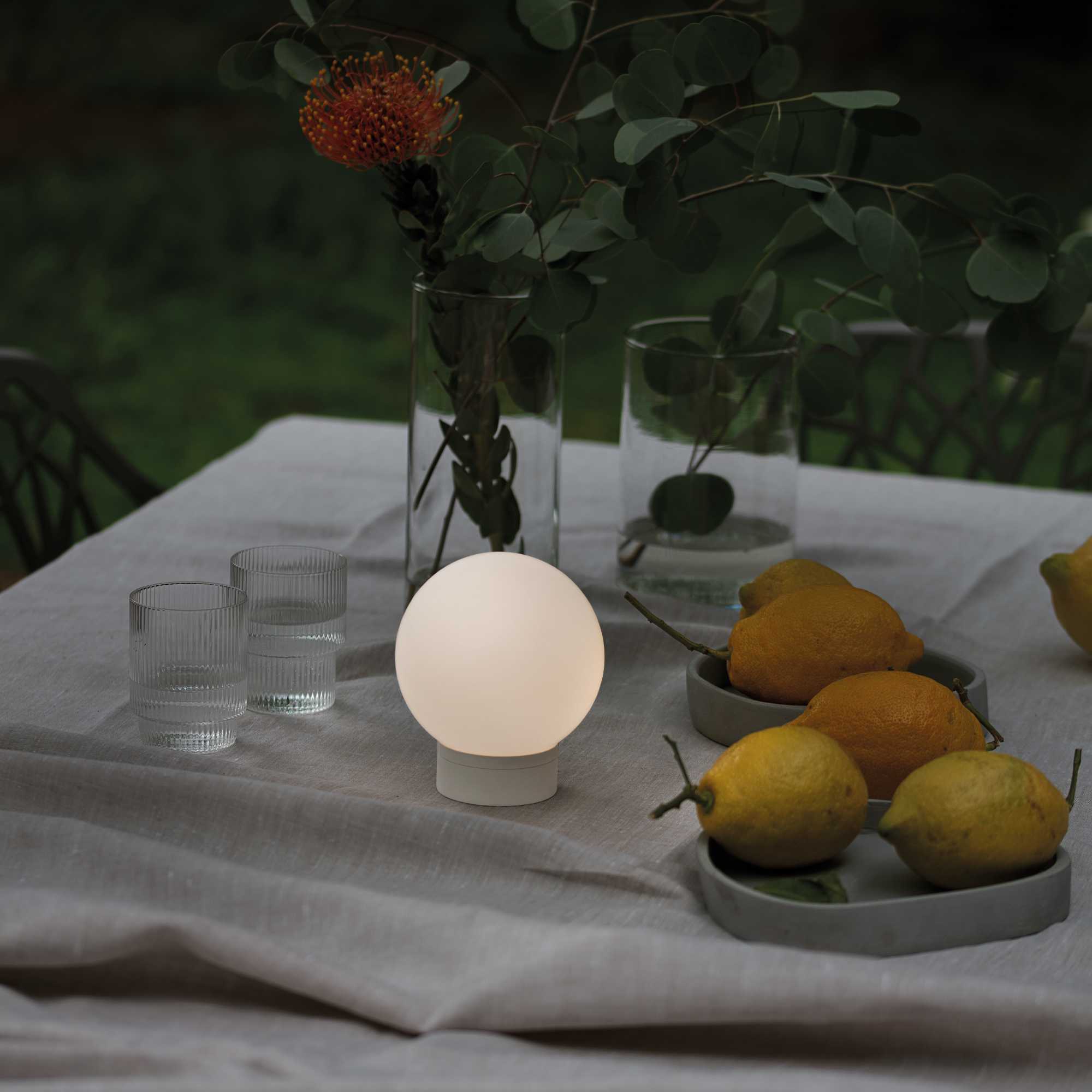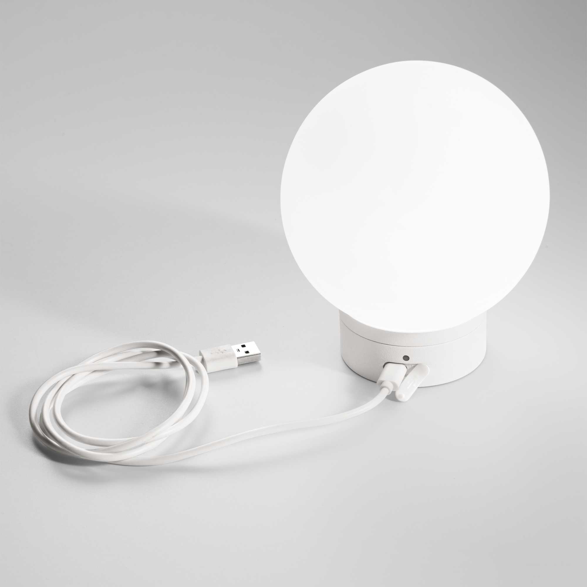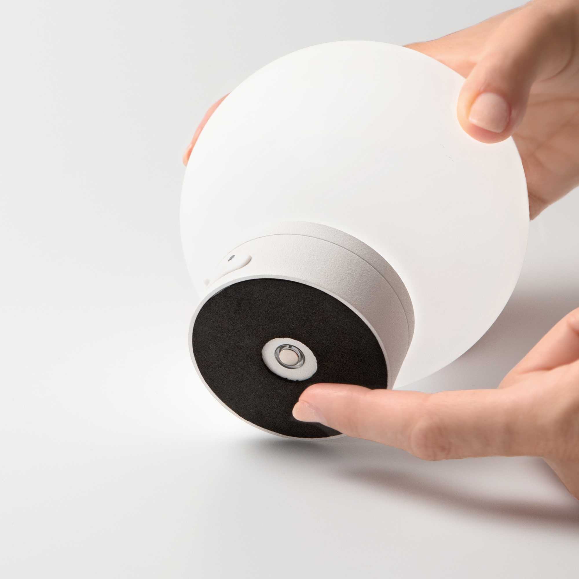 алуминий с прахово нанесено бяло покритие, бяло издухано ецвано стъкло, преносимо осветително тяло със зареждаема батерия с автономност 7h, време за зареждане 4h, интегриран ключ ON/OFF