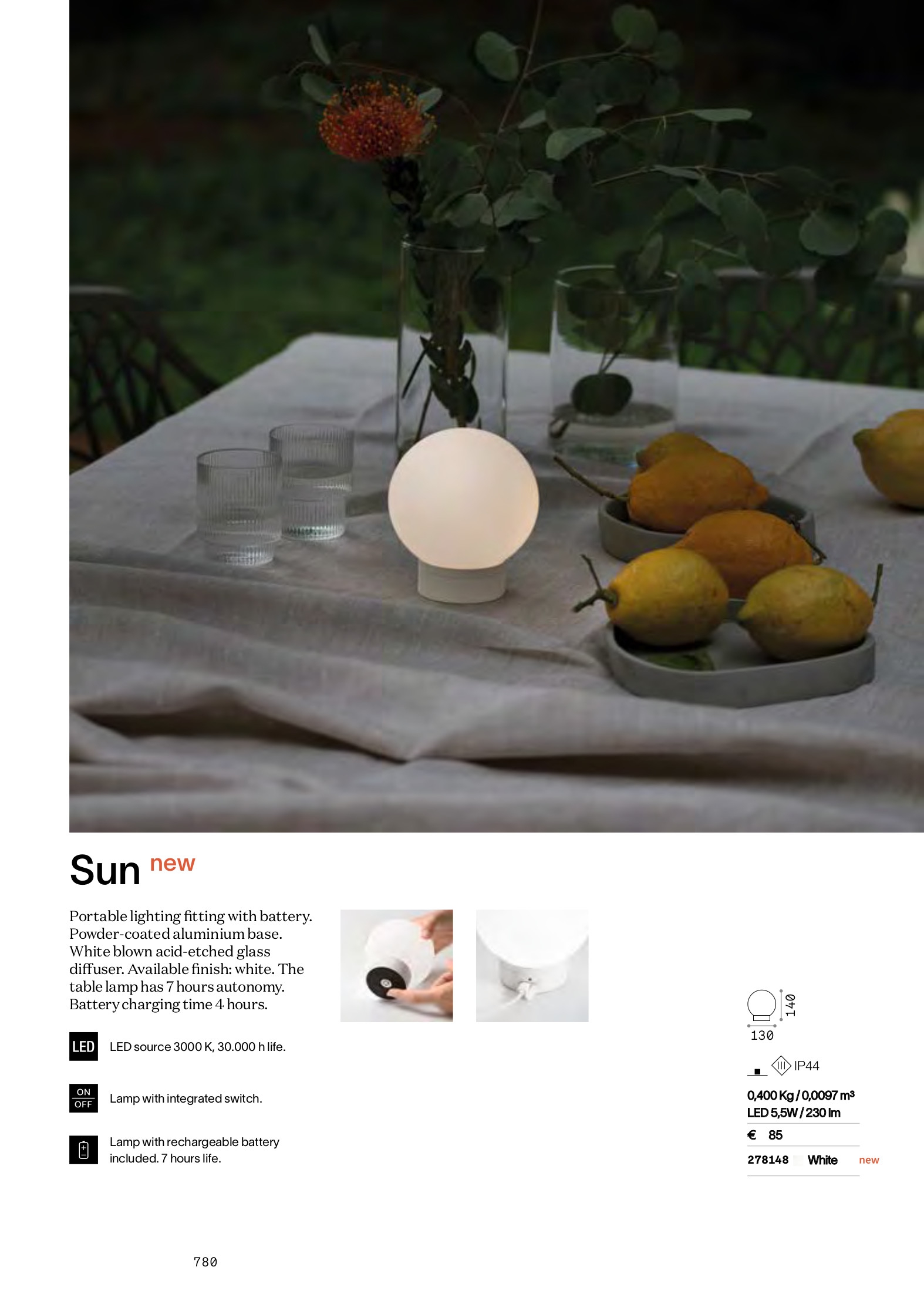 Осветителното тяло SUN TL ще осигури комфорт и естетика във всяко помещение, в което се постави. Цялостната визия и дизайн на лампата и вложените в изработката й материали, като алуминий с прахово нанесено бяло покритие, бяло издухано ецвано стъкло, преносимо осветително тяло със зареждаема батерия с автономност 7h, време за зареждане 4h, интегриран ключ ON/OFF, ще допринесат за един неповторим стил. Благодарение на дългогодишния опит, качествените материали и строгия контрол на качеството на изработка на производителя Ideal-Lux (Италия), SUN TL е на високо европейско ниво.