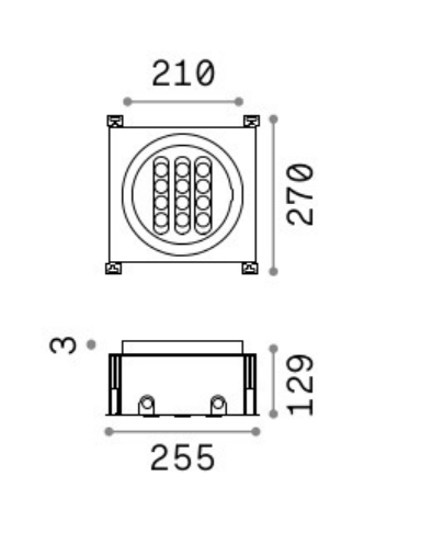 лят алуминий, квадратна рамка от неръждаема стомана 316L, стъклен дифузьор, 3 LED модула, индивидуално регулируеми +/-30° с външен щифт, устойчивост на удар IK10