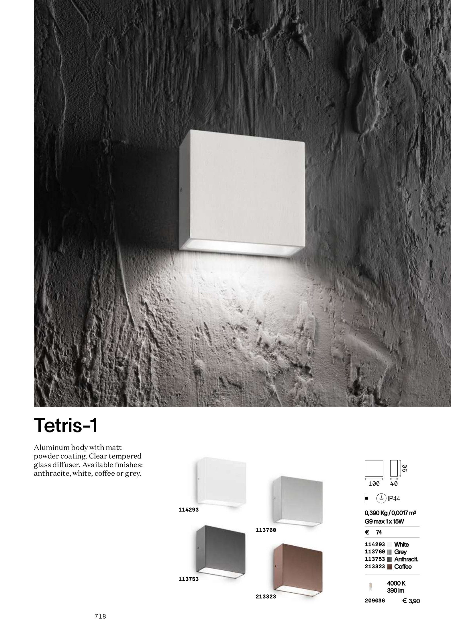Осветителното тяло TETRIS-1 AP1 COFFEE ще осигури комфорт и естетика във всяко помещение, в което се постави. Цялостната визия и дизайн на лампата и вложените в изработката й материали, като алуминиев корпус прахово покритие с цвят кафе мат, дифузьор от прозрачно закалено стъкло, ще допринесат за един неповторим стил. Благодарение на дългогодишния опит, качествените материали и строгия контрол на качеството на изработка на производителя Ideal-Lux (Италия), TETRIS-1 AP1 COFFEE е на високо европейско ниво.