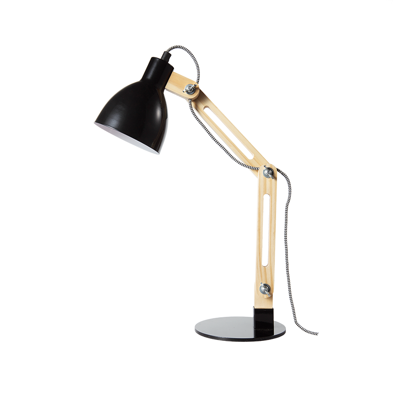 метал в черен цвят, дърво в естествен цвят, кабел 1.65m с текстилна оплетка в бяло и черно, ключ ON/OFF