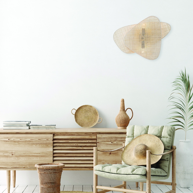 За стила и естетиката на обстановката допринасят, както цялостната визия и дизайн на осветителното тяло, така и вложените в изработката качествени материали, като: ратан в естествен цвят, метал в черно.