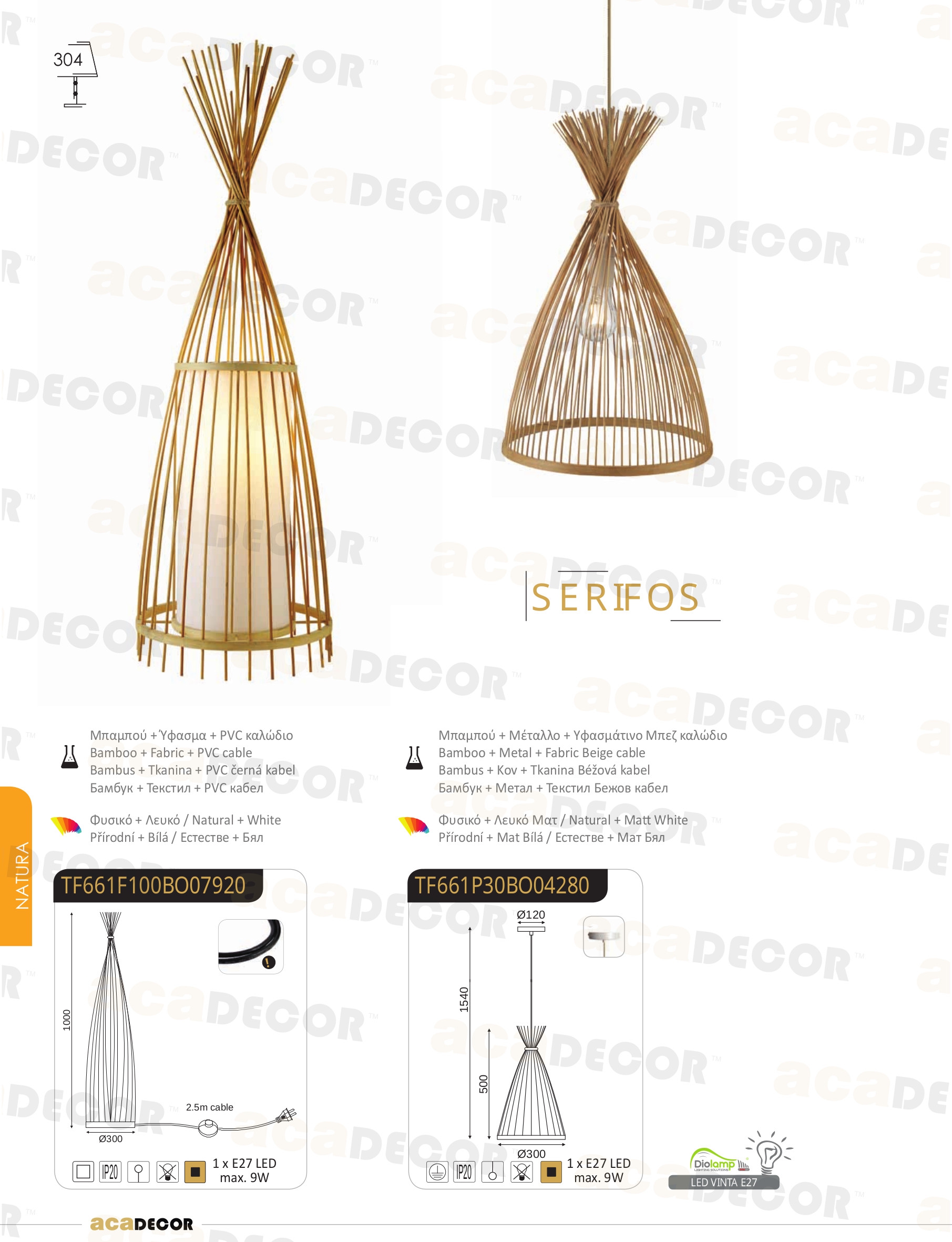Осветителното тяло TF661F100BO ще осигури комфорт и естетика във всяко помещение, в което се постави. Цялостната визия и дизайн на лампата и вложените в изработката й материали, като бамбук, метал в матово бяло, кабел 2.5m с текстилна оплетка в бежово, ключ ON/OFF, ще допринесат за един неповторим стил. Благодарение на дългогодишния опит, качествените материали и строгия контрол на качеството на изработка на производителя ACA-Lighting (Гърция), TF661F100BO е на високо европейско ниво.