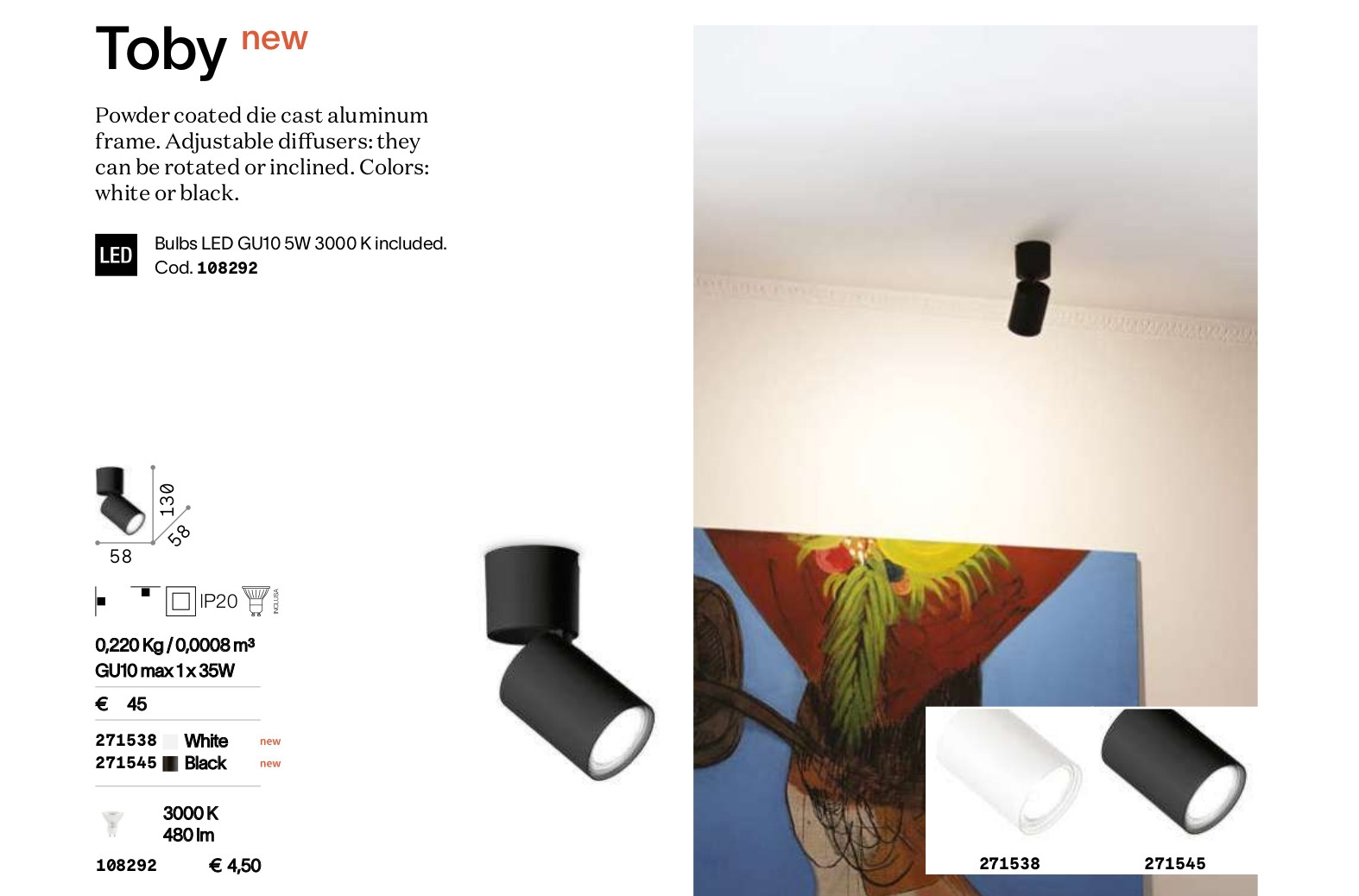 Осветителното тяло TOBY PL1 BIANCO представлява лед спот лампа в съвременен стил. TOBY PL1 BIANCO е от категорията и е подходящо за осветяване на различни помещения и пространства като: всекидневна / хол, спалня, кухня, трапезария, коридор, антре, стълбище, офис.