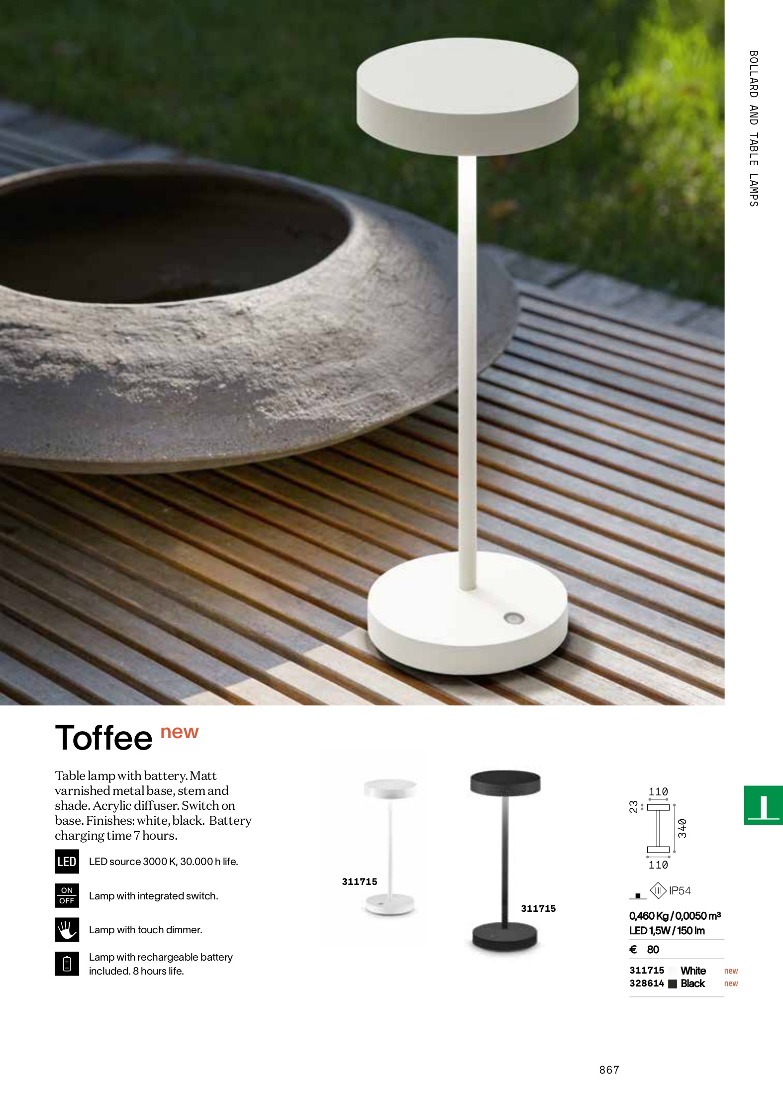 Лед настолна лампа, външна лампа TOFFEE TL NERO ще осигури комфорт и естетика във всяко помещение, в което се постави. Цялостната визия и дизайн на led лампата и вложените в изработката й материали, като метал в цвят черен мат, превключвател интегриран в основата, време на зареждане 7h, димер с докосване, ще допринесат за един неповторим стил. Благодарение на дългогодишния опит в производството на лед осветление, качествените материали и строгия контрол на качеството на изработка на производителя Ideal-Lux (Италия), TOFFEE TL NERO е на високо европейско ниво.