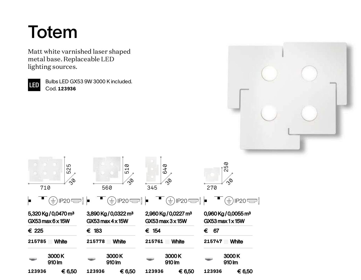 Осветителното тяло TOTEM PL6 ще осигури комфорт и естетика във всяко помещение, в което се постави. Цялостната визия и дизайн на лампата и вложените в изработката й материали, като изрязан с лазер метал в матово бяло, сменяеми LED източници, ще допринесат за един неповторим стил. Благодарение на дългогодишния опит, качествените материали и строгия контрол на качеството на изработка на производителя Ideal-Lux (Италия), TOTEM PL6 е на високо европейско ниво.