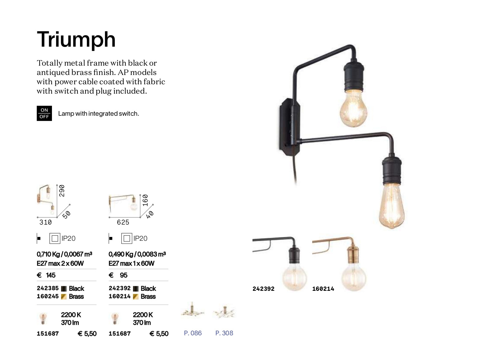 Осветителното тяло TRIUMPH AP2 NERO ще осигури комфорт и естетика във всяко помещение, в което се постави. Цялостната визия и дизайн на лампата и вложените в изработката й материали, като метал в цвят черен мат, кабел с черна текстилна оплетка, интегриран ключ ON/OFF, ще допринесат за един неповторим стил. Благодарение на дългогодишния опит, качествените материали и строгия контрол на качеството на изработка на производителя Ideal-Lux (Италия), TRIUMPH AP2 NERO е на високо европейско ниво.