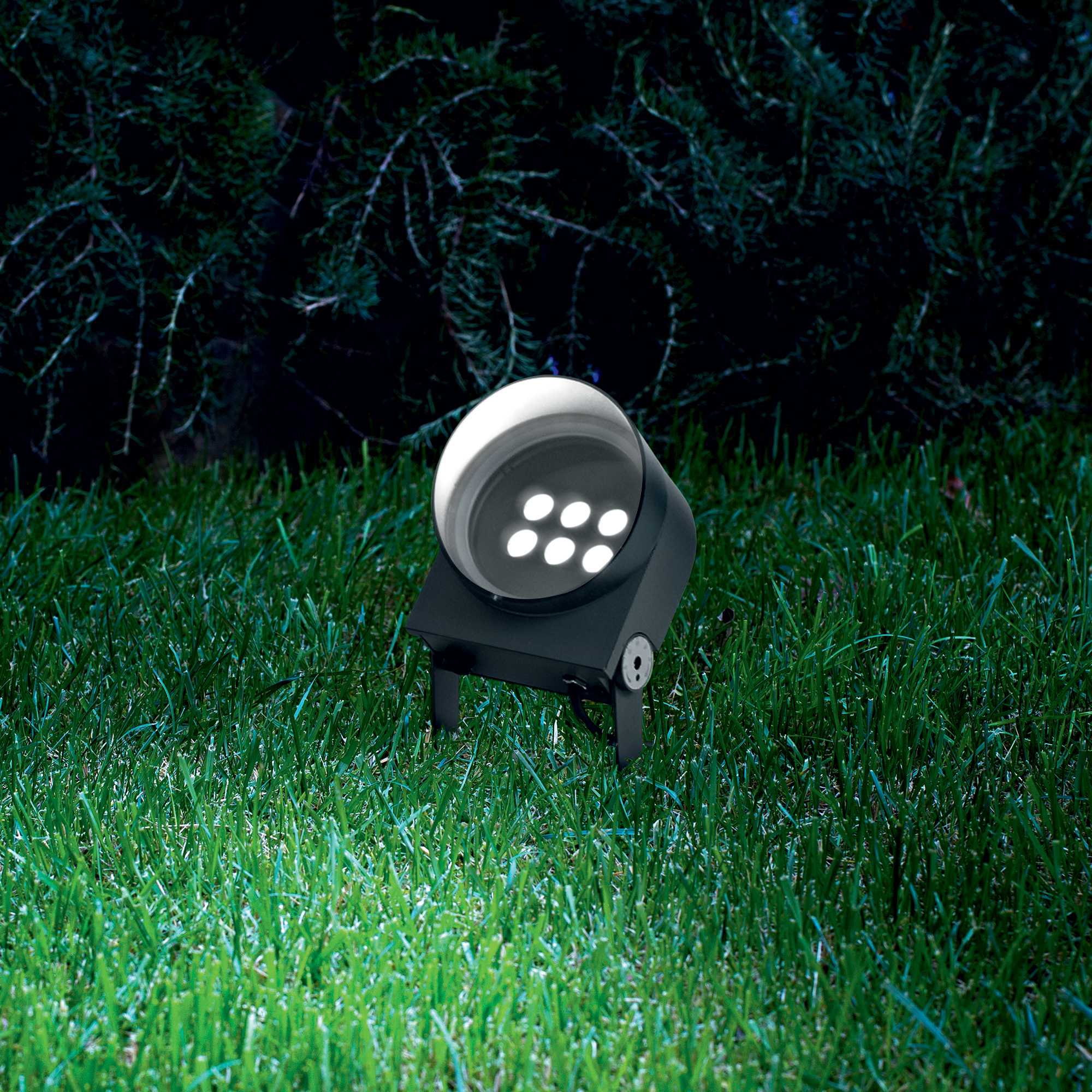 алуминий отлят под налягане в цвят антрацит, дифузер от прозрачно стъкло, LED източник с много дълъг живот 50 000 часа, регулируема посока на светене, колче и козирка са опции