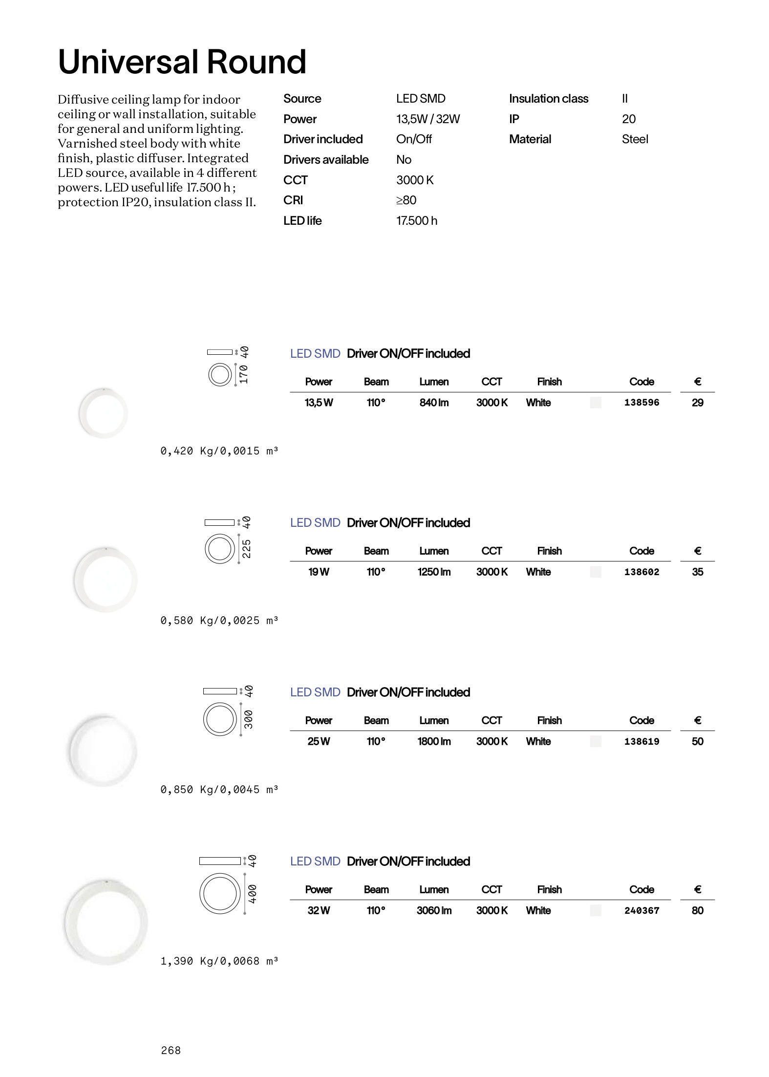 Лед плафон UNIVERSAL PL D40 ROUND ще осигури комфорт и естетика във всяко помещение, в което се постави. Цялостната визия и дизайн на led лампата и вложените в изработката й материали, като лакирана стомана с бяло покритие, дифузер от полимер в бяло, ще допринесат за един неповторим стил. Благодарение на дългогодишния опит в производството на лед осветление, качествените материали и строгия контрол на качеството на изработка на производителя Ideal-Lux (Италия), UNIVERSAL PL D40 ROUND е на високо европейско ниво.